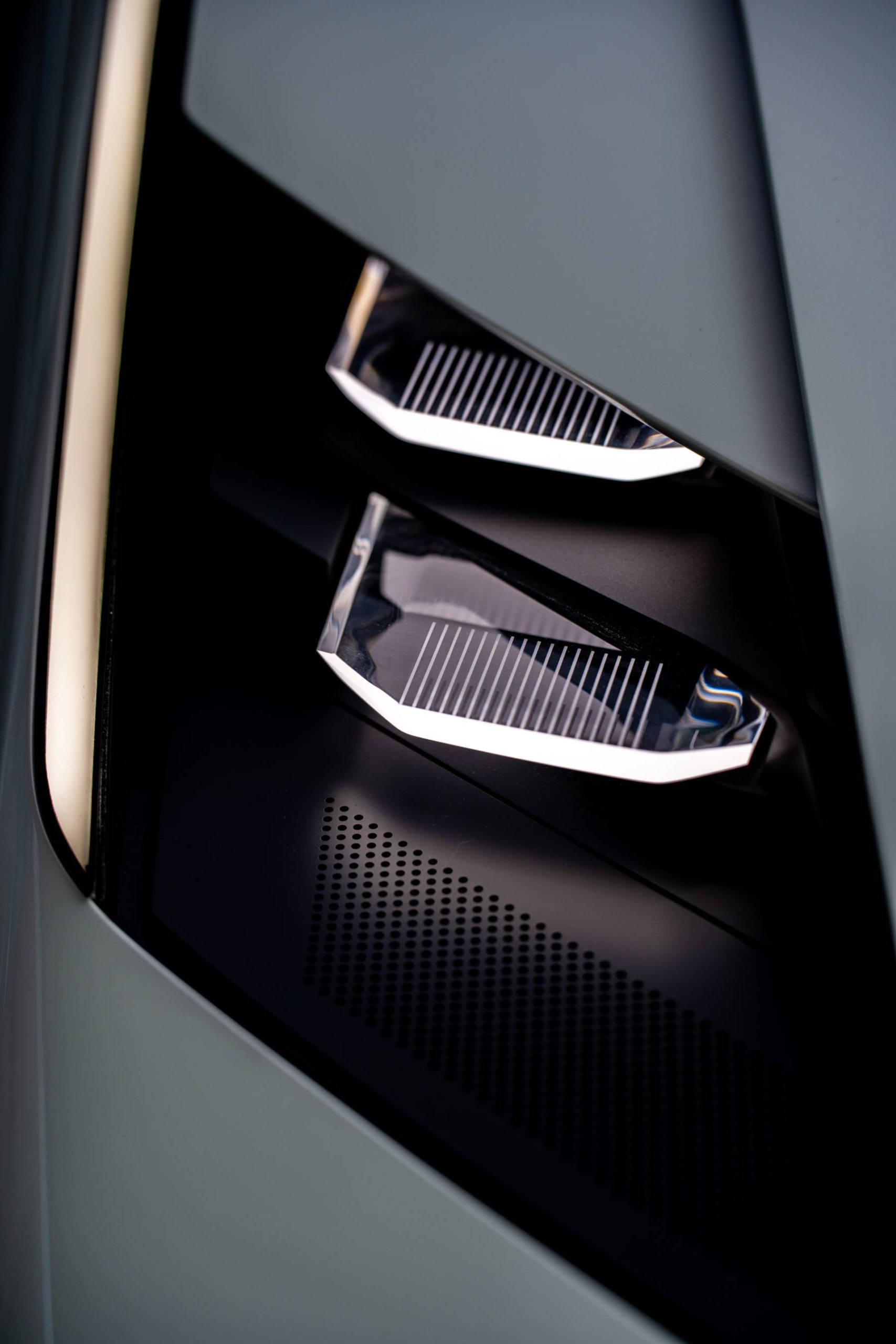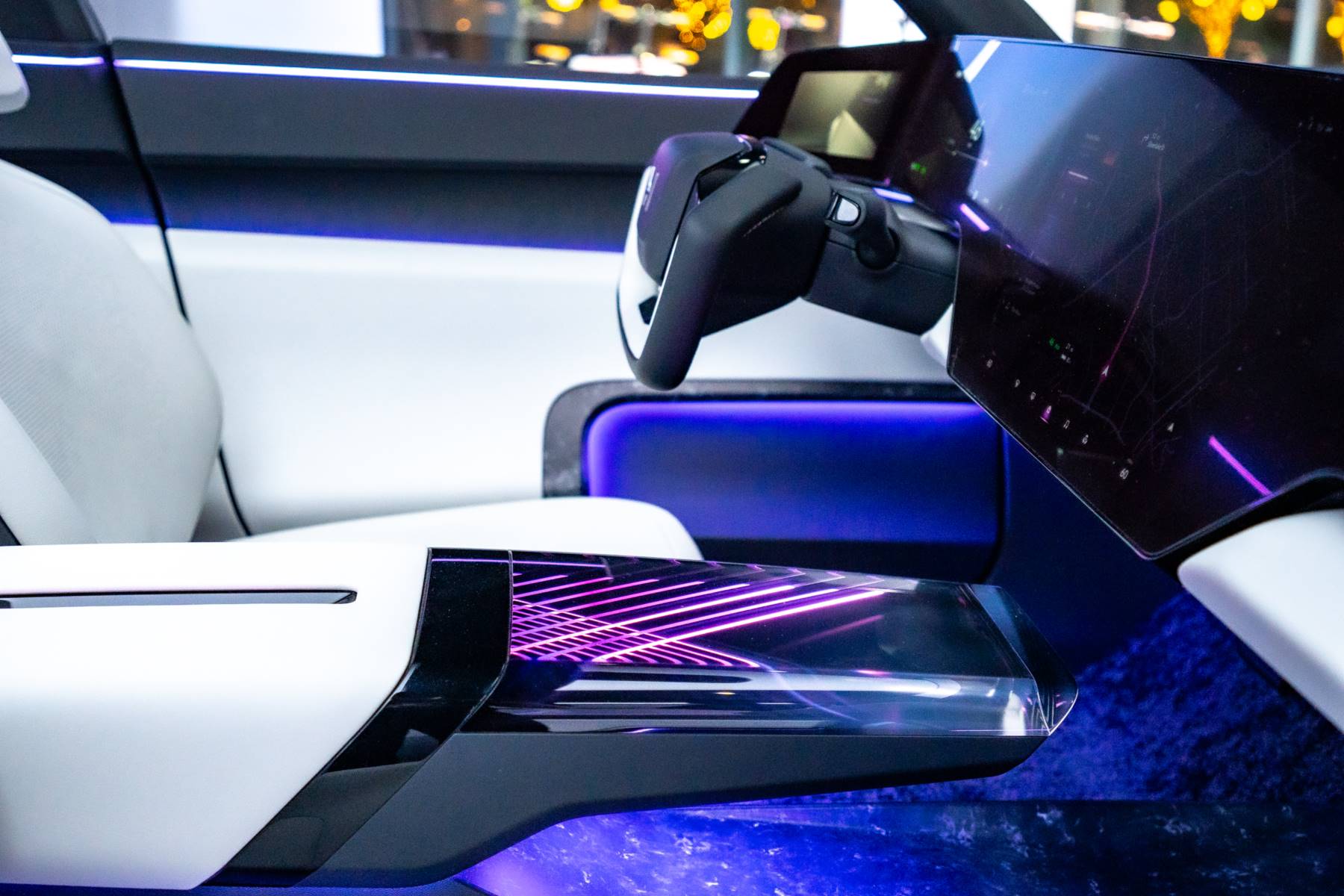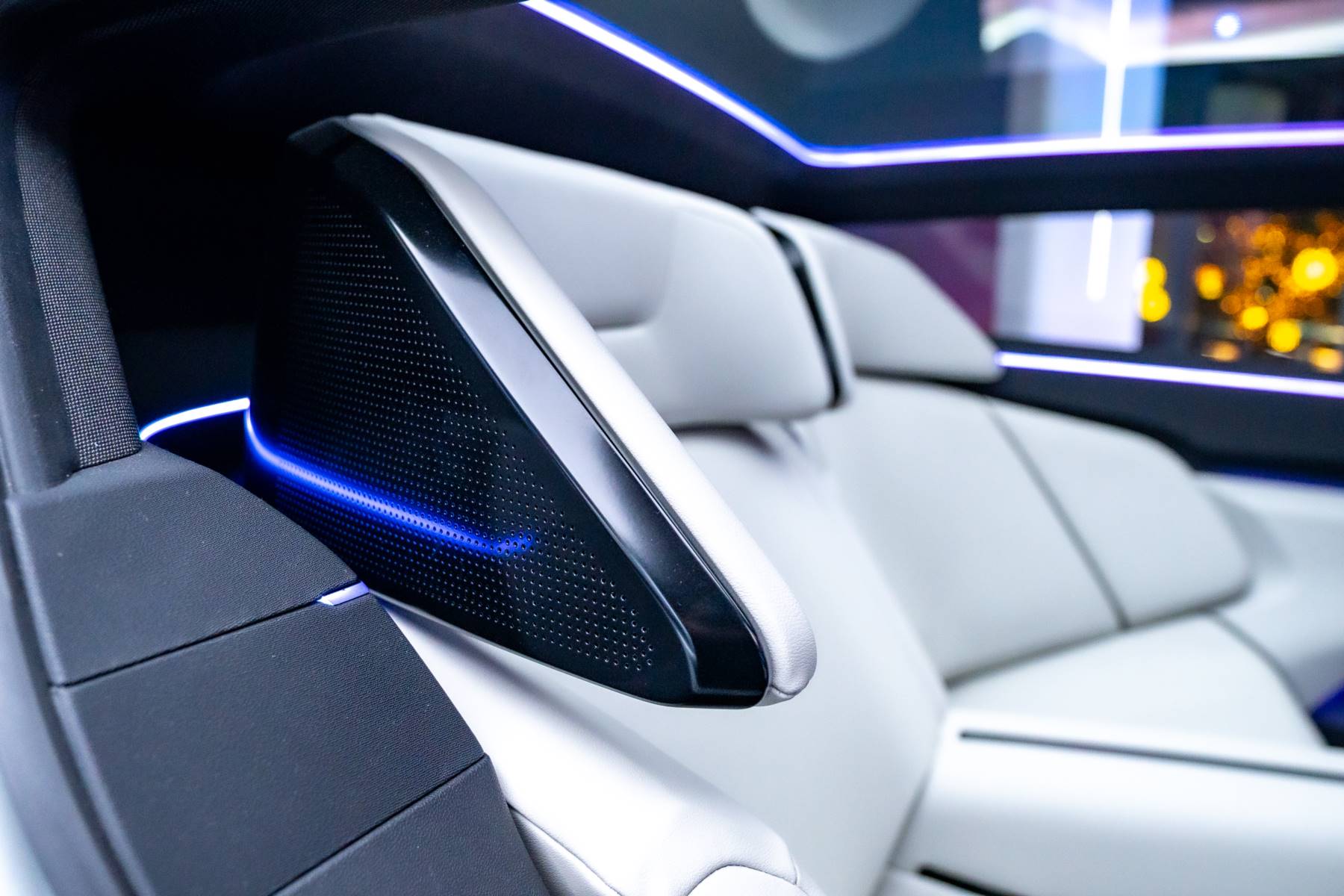 ด้านหน้า: องค์ประกอบที่ปกติมักแยกชิ้นกัน เช่น ไฟหน้า ฝาปิดช่องชาร์จ และโลโก้เรืองแสง ถูกออกแบบให้รวมอยู่ใน “พื้นที่หน้าจอ” เดียวกัน ส่งผลให้หน้ารถดูสะอาด ล้ำ และมีเอกลักษณ์ทันทีที่เห็น