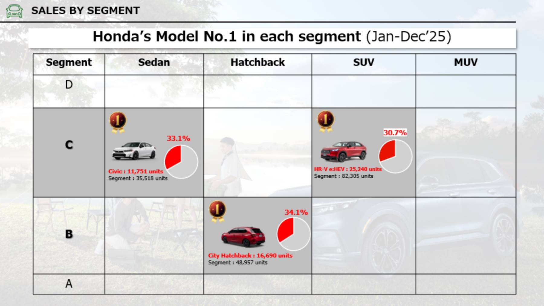 ในปี 2568 ฮอนด้ามียอดขายสะสม 74,044 คัน ครองอันดับ 2 ของตลาดรถยนต์นั่งไทย และมีส่วนแบ่งตลาด 18% ขณะที่กลุ่มรถยนต์พลังงานไฟฟ้า xEV ทำยอดขายได้ถึง 55,495 คัน หรือราว 20% ของตลาด