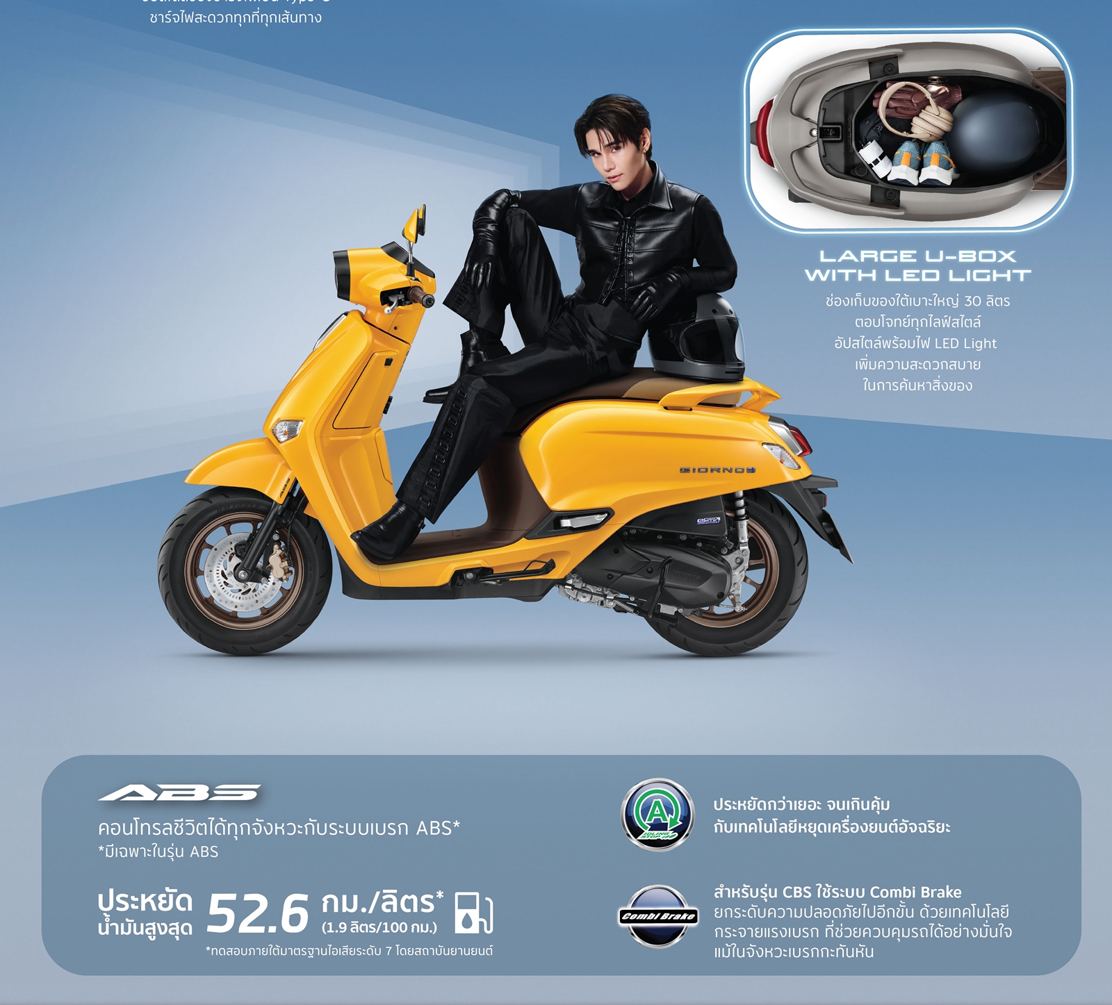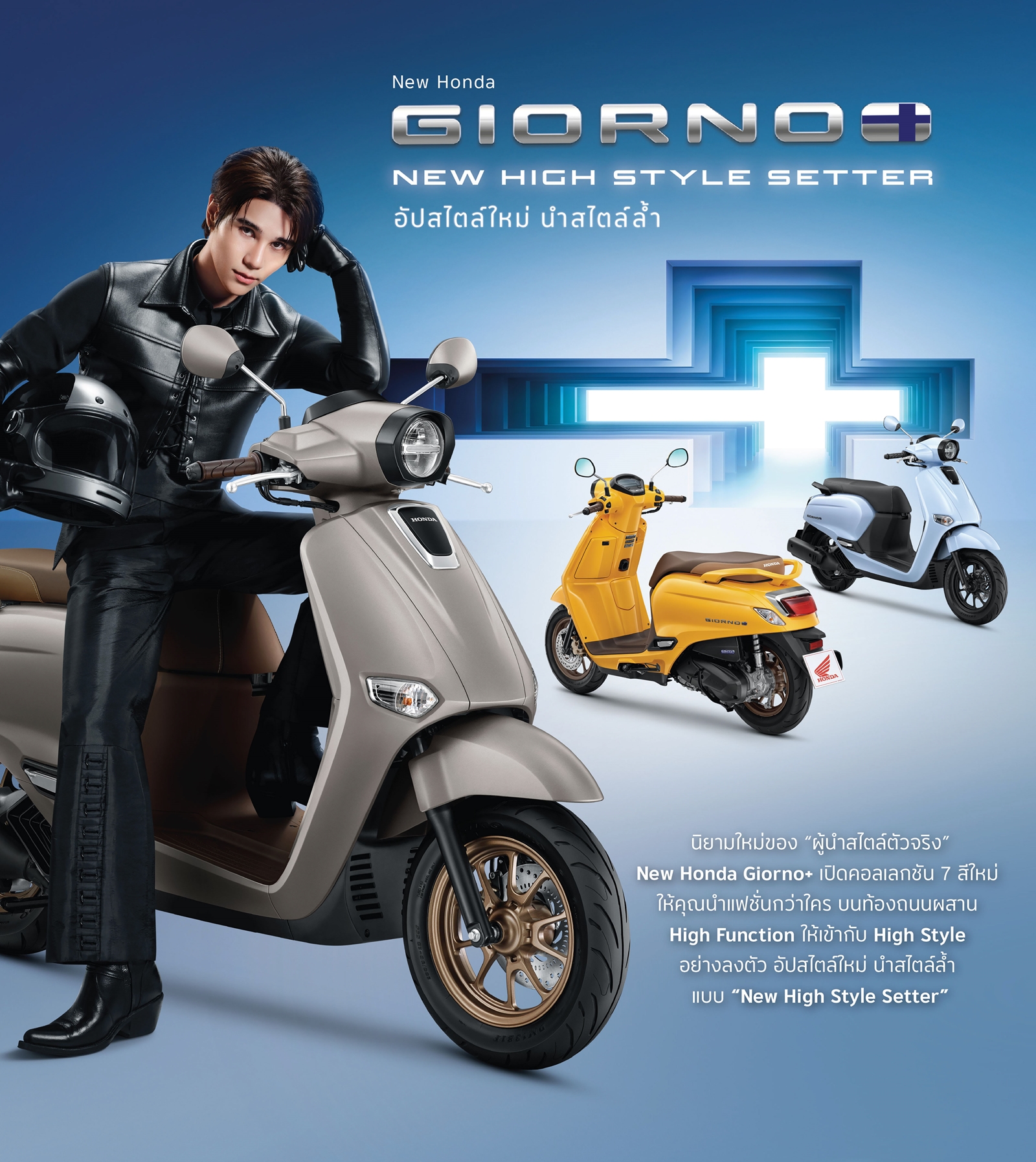 Honda ขยับความน่าสนใจของสกู๊ตเตอร์สายแฟชั่น-พรีเมียมด้วย Giorno+ 125 ที่มาพร้อม 2 รุ่นย่อยให้เลือกคือ รุ่น CBS ราคา 63,700 บาท และ รุ่น ABS ราคา 68,700 บาท ชูจุดเด่นเรื่องโทนสีใหม่ ดีไซน์ที่เท่ขึ้น รวมถึงฟังก์ชันใช้งานจริงอย่างช่องเก็บของใต้เบาะ ความจุ 30 ลิตร พร้อมไฟส่องสว่างแบบ LED และขุมพลัง eSP+ 125 ซีซี 4 วาล์ว ที่ขึ้นชื่อทั้งความนุ่มนวลและความประหยัดสูงสุด 52.6 กม./ลิตร
