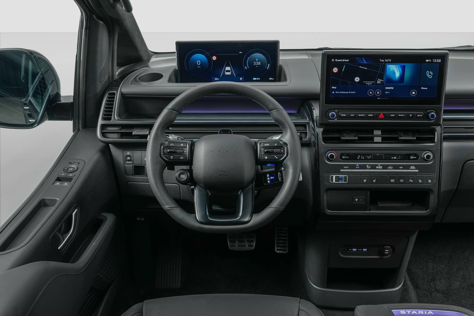 STARIA Electric ใช้หน้าจอดิจิทัลคู่ขนาด 12.3 นิ้ว (มาตรวัด + อินโฟเทนเมนต์) โดยยังคงมี ปุ่มกดจริง สำหรับฟังก์ชันที่ใช้บ่อย เพื่อลดภาระสายตาและเพิ่มความมั่นใจขณะขับ
