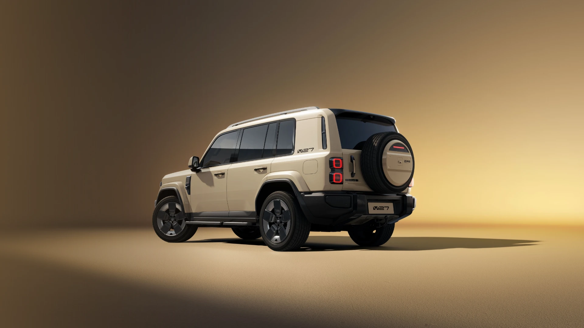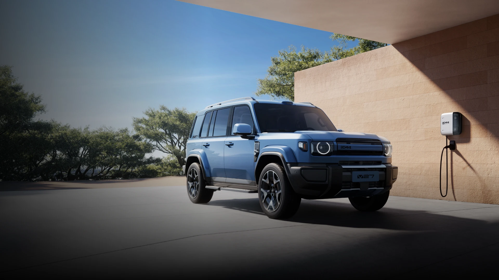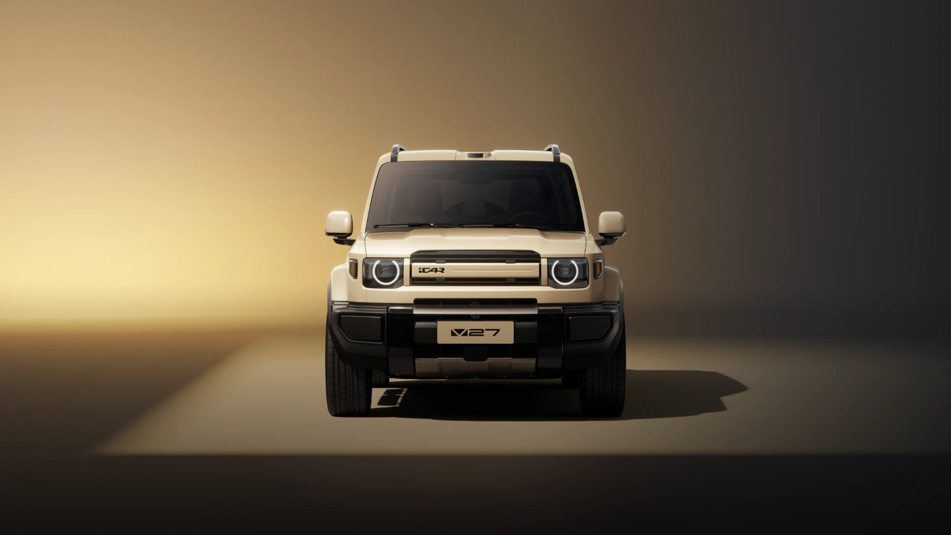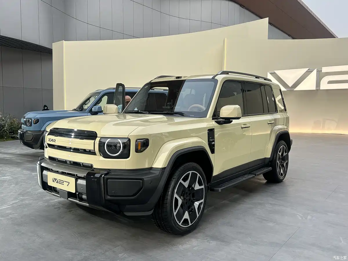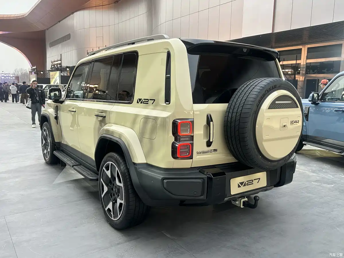 iCAR V27 ยังคงรักษาเอกลักษณ์การออกแบบสไตล์ “กล่องสี่เหลี่ยม” ที่ดูดุดันและแข็งแกร่ง ด้านหน้าโดดเด่นด้วยกระจังหน้าแบบแถบแคบที่จับคู่กับโคมไฟทรงเหลี่ยมและแถบไฟวงแหวน โดยใช้หลอดไฟ LED ทั้งระบบ พร้อมฟังก์ชันควบคุมไฟสูงอัจฉริยะ ตัวรถมีสีภายนอกให้เลือกมากถึง 7 สี ได้แก่ สีอูฐ, ดำ, เงิน, เทา, ขาว, น้ำเงิน และเหลือง