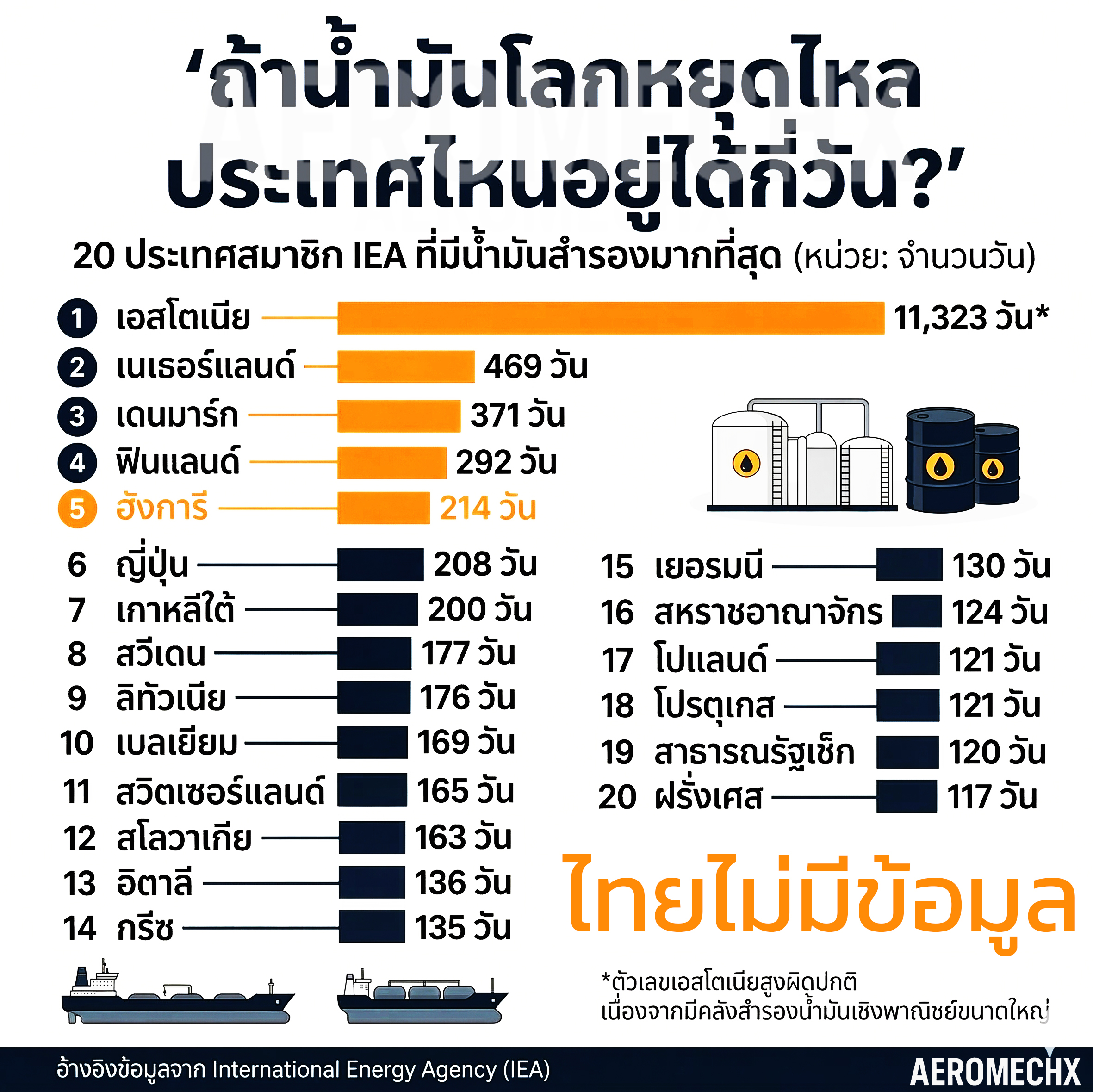 ประเทศที่มีคลังน้ำมันสำรองพร้อมใช้ มากสุดในโลก เอสโตเนีย 11,323 วัน ข้อมูลจาก IEA