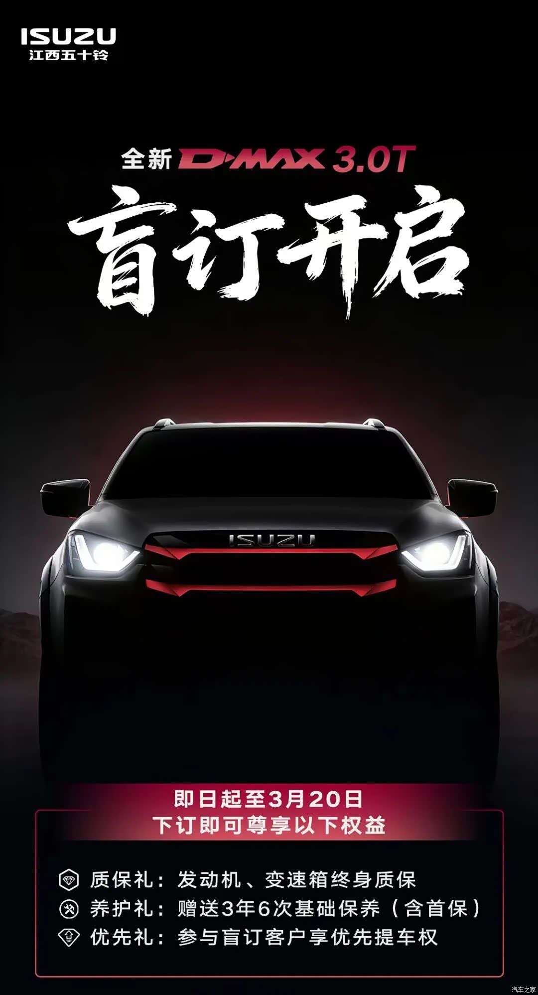 Isuzu D-MAX 3.0T เริ่มเปิดให้จองล่วงหน้าแบบ Blind Order ในประเทศจีนแล้ว โดยเปิดรับจองตั้งแต่วันนี้ไปจนถึงวันที่ 20 มีนาคม พร้อมสิทธิพิเศษ 3 รายการสำหรับผู้ที่ร่วมจองช่วงนี้ ได้แก่ แพ็กเกจบำรุงรักษาพื้นฐาน 3 ปี 6 ครั้ง (รวมเช็กระยะแรก), รับประกันเครื่องยนต์และเกียร์ตลอดอายุการใช้งาน และสิทธิ์รับรถก่อน (Priority Delivery) ตามรายงานจากสื่อยานยนต์จีน