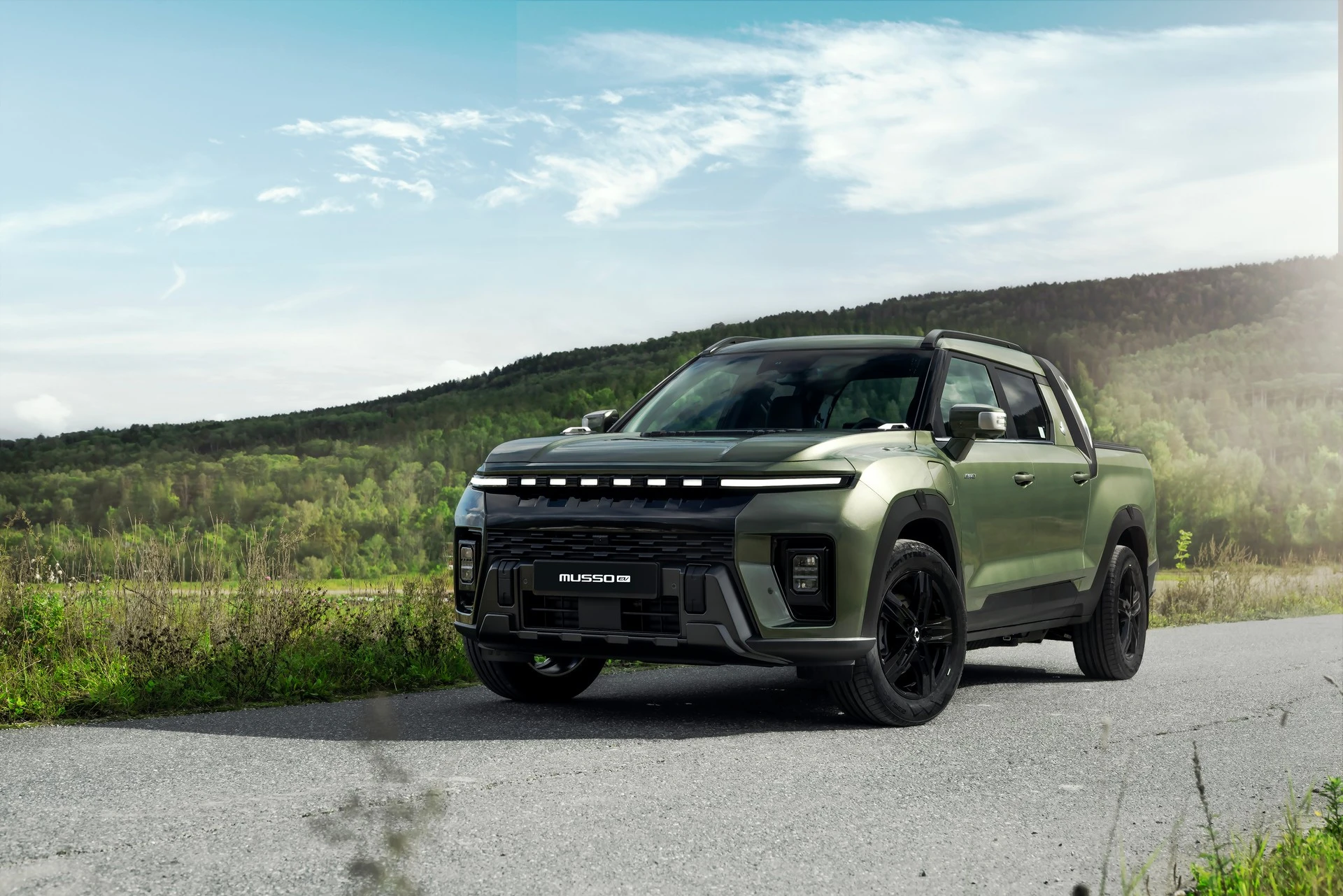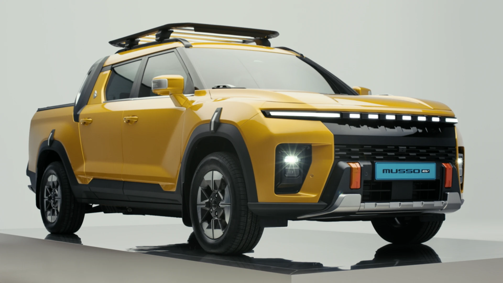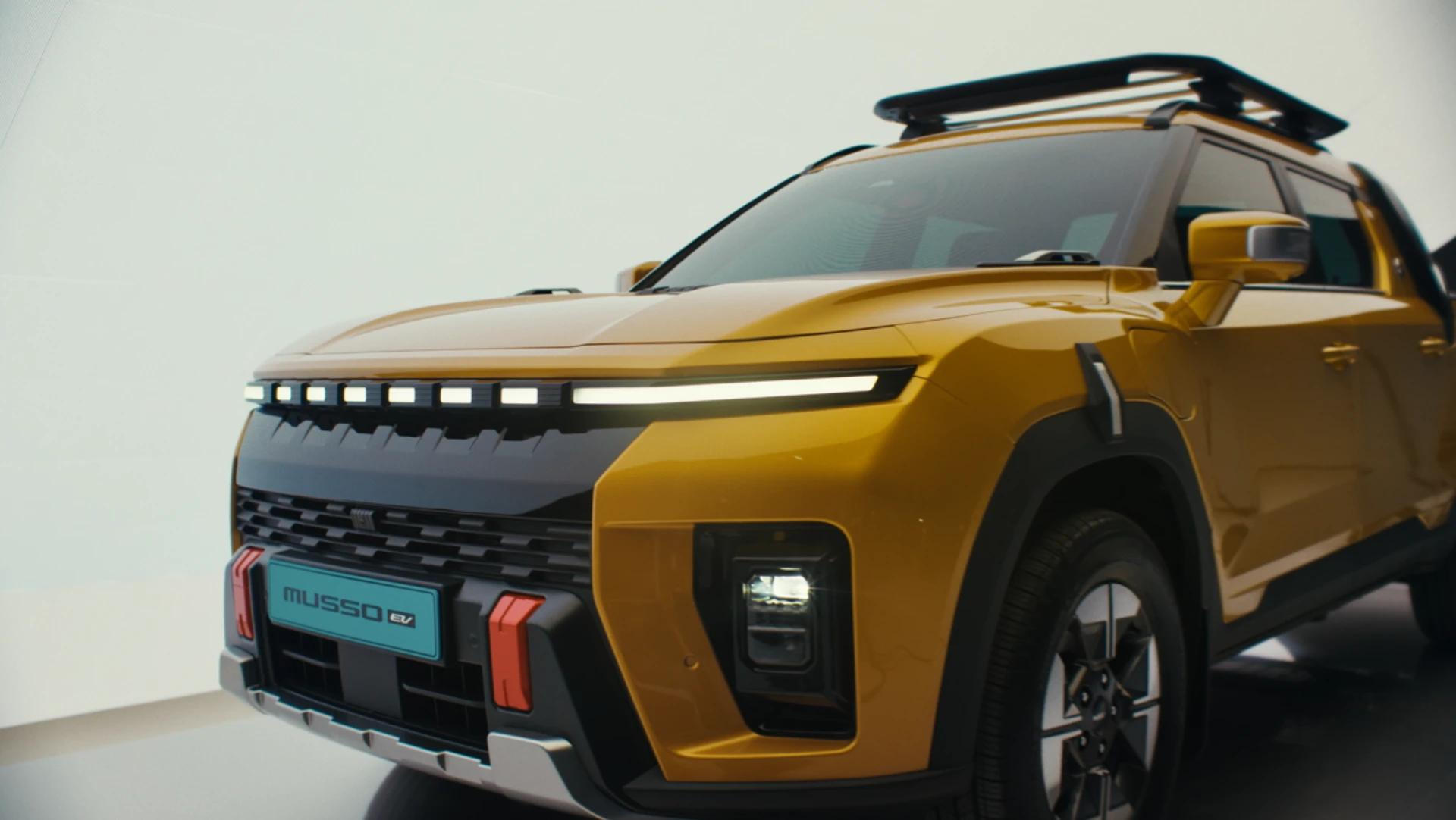 Musso EV ยังคงสัดส่วนตัวถังที่สูง–แข็งแรงแบบกระบะดั้งเดิม แต่ปรับด้านหน้าให้ทันสมัยขึ้น