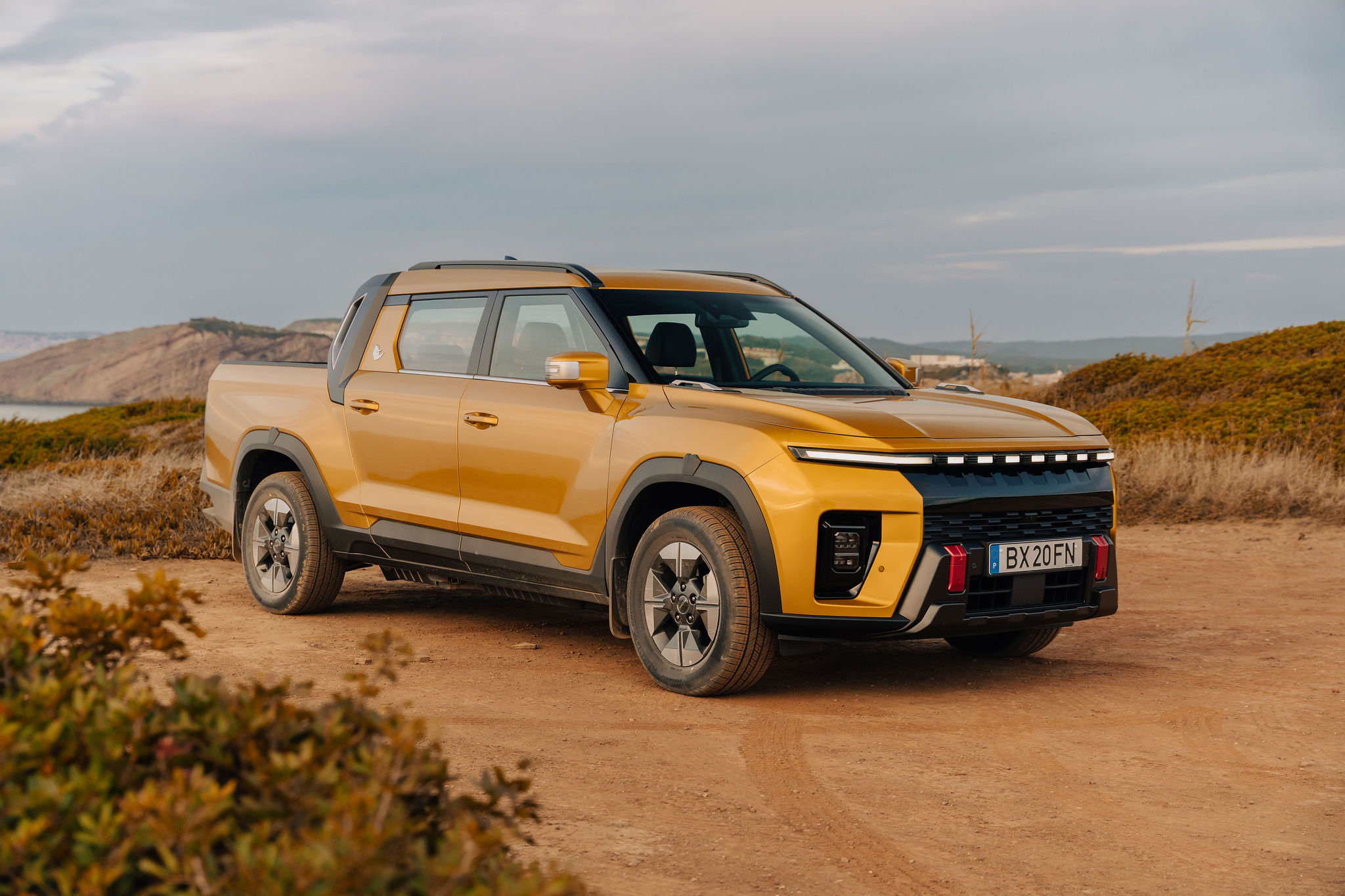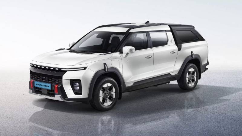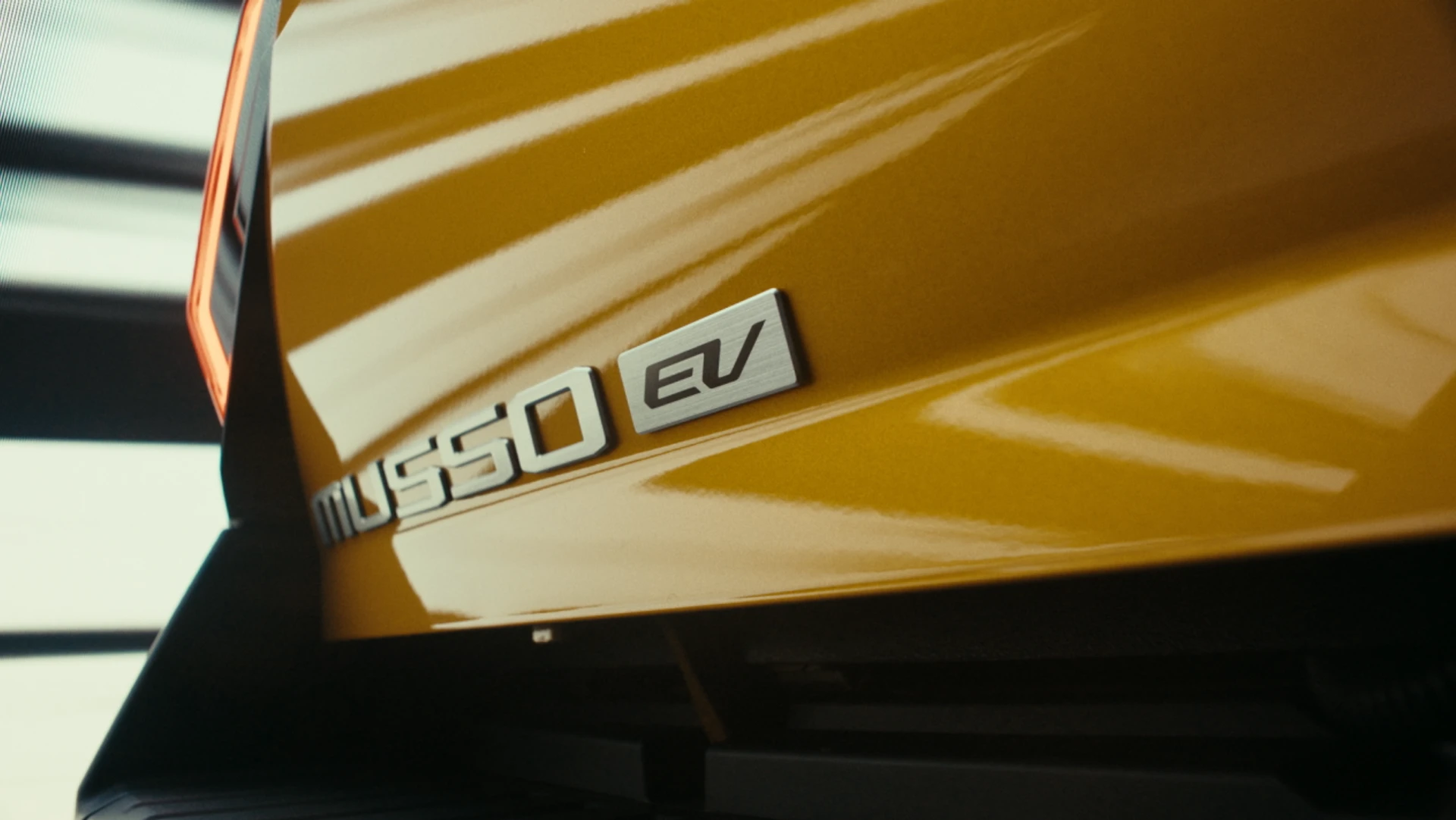 Musso EV ยังคงสัดส่วนตัวถังที่สูง–แข็งแรงแบบกระบะดั้งเดิม แต่ปรับด้านหน้าให้ทันสมัยขึ้น