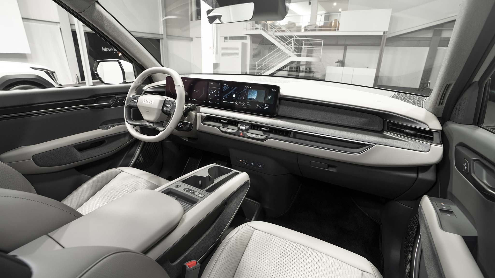 ภายในห้องโดยสาร มีให้เลือก 6 – 7 ที่นั่ง ติดตั้งแผงหน้าแบบลอยขนาด 12.3 นิ้ว และ หน้าจออินโฟเทนเม้นท์ขนาด 12.3 นิ้ว พร้อม หน้าจอขนาอเล็กแสดงผลขนาด 5 นิ้ว KIA ไม่ได้ระบุว่าใช้ทำอะไรมาก แต่หลักๆมีไว้สำหรับการควบคุมสภาพอากาศโดยเฉพาะ
