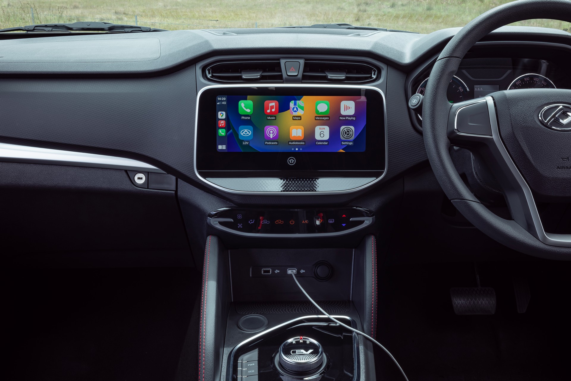 ภายในห้องโดยสารออกแบบเรียบง่าย เบาะหนังเทียม เบาะนั่งคู่หน้าแบบไฟฟ้า หน้าปัดแบบอะนาล็อก หน้าจอสัมผัสส่วนกลางแบบฝั่ง 10.25 นิ้ว รองรับ Apple CarPlay เชื่อมต่อ Bluetooth/USB กล้องมองหลัง แป้นเปลี่ยนเกียร์แบบวงกลมที่มีสัญลักษณ์ N, R และ D พอร์ต USB-A สองพอร์ตและช่องเสียบ 12V พร้อมส่วนจัดเก็บโทรศัพท์