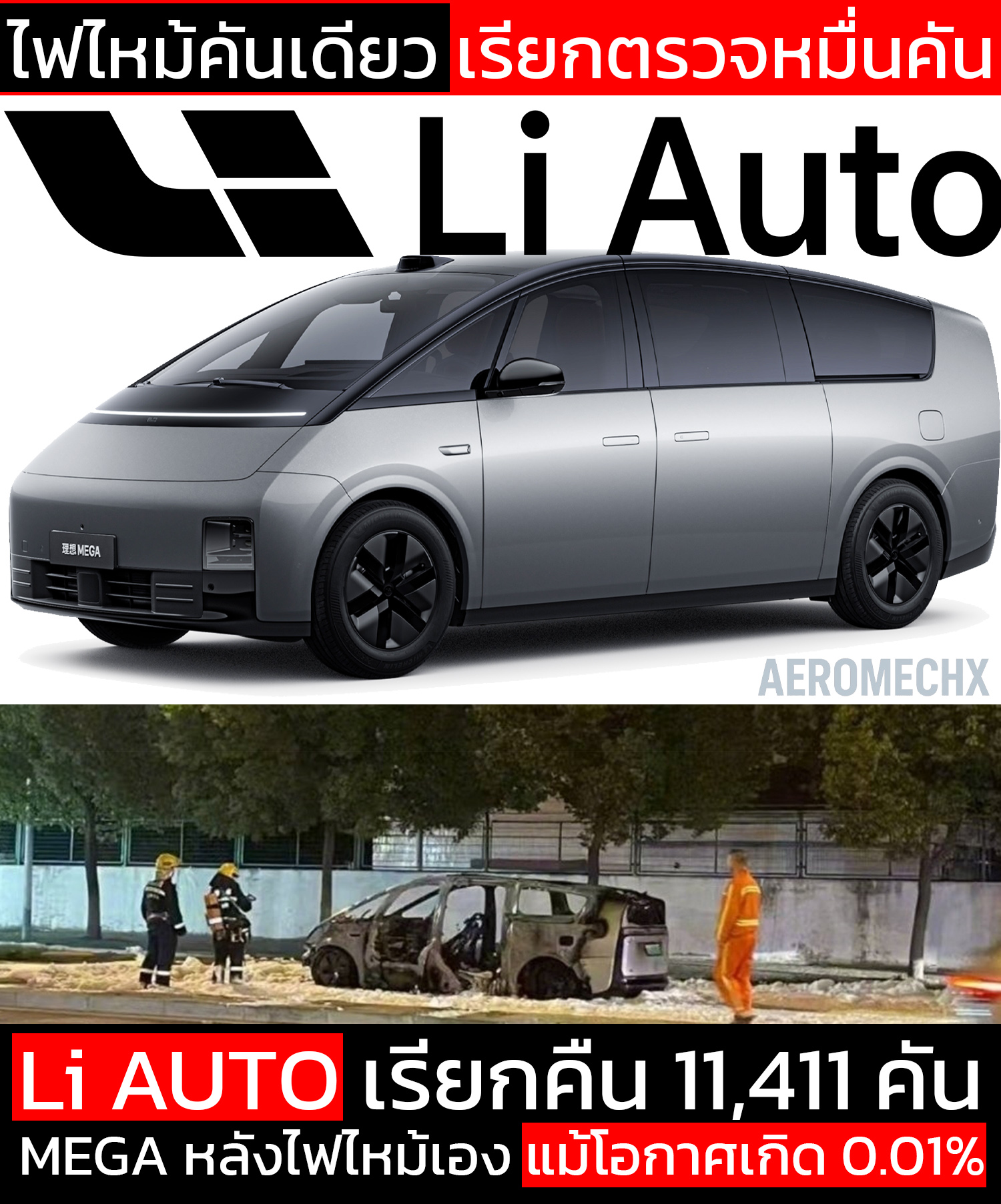 ไฟไหม้คันเดียว เรียกตรวจหมื่นคัน Li Auto เรียกคืน MEGA หลังไฟไหม้เอง แม้โอกาศเกิด 0.01%