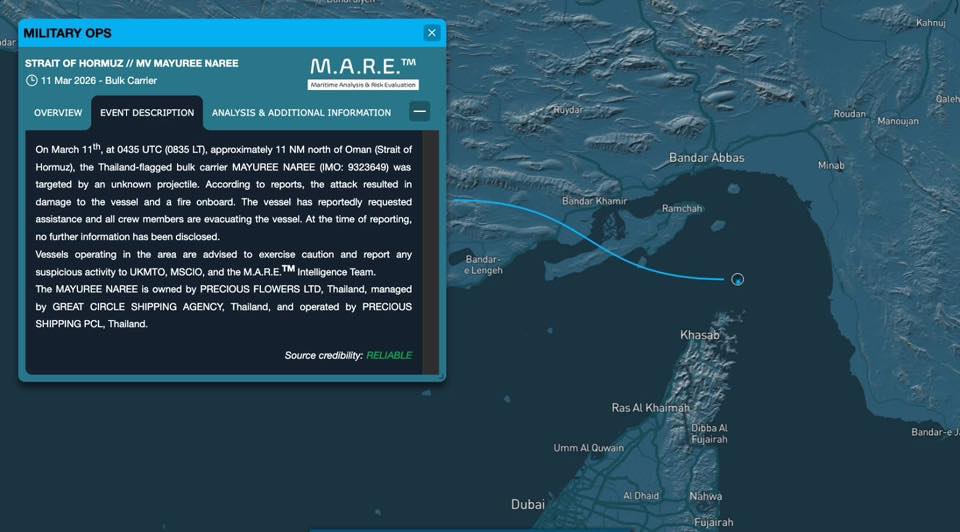 หนึ่งในเหตุการณ์รุนแรงที่สุดของวันนี้เกิดขึ้นกับ เรือ Mayuree Naree (มยุรี นารี) ซึ่งเป็นเรือที่ชักธงชาติไทยและอยู่ภายใต้การบริหารจัดการของบริษัท Precious Shipping โดยเรือลำดังกล่าวถูกโจมตีด้วยขีปนาวุธบริเวณตอนเหนือของประเทศโอมาน ใกล้กับช่องแคบฮอร์มุซ ส่งผลให้เกิดเพลิงไหม้บนเรือและต้องเริ่มกระบวนการอพยพลูกเรือทันที