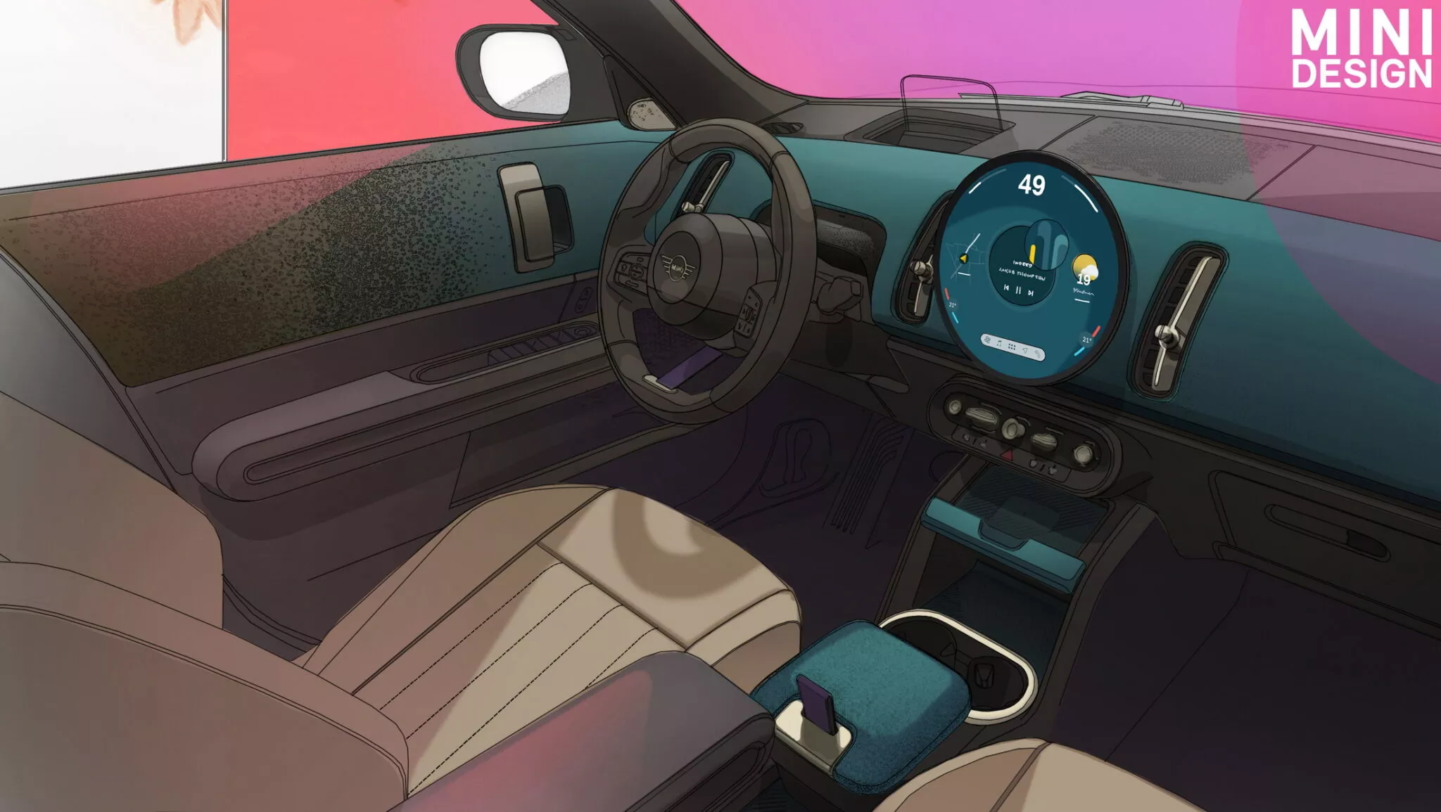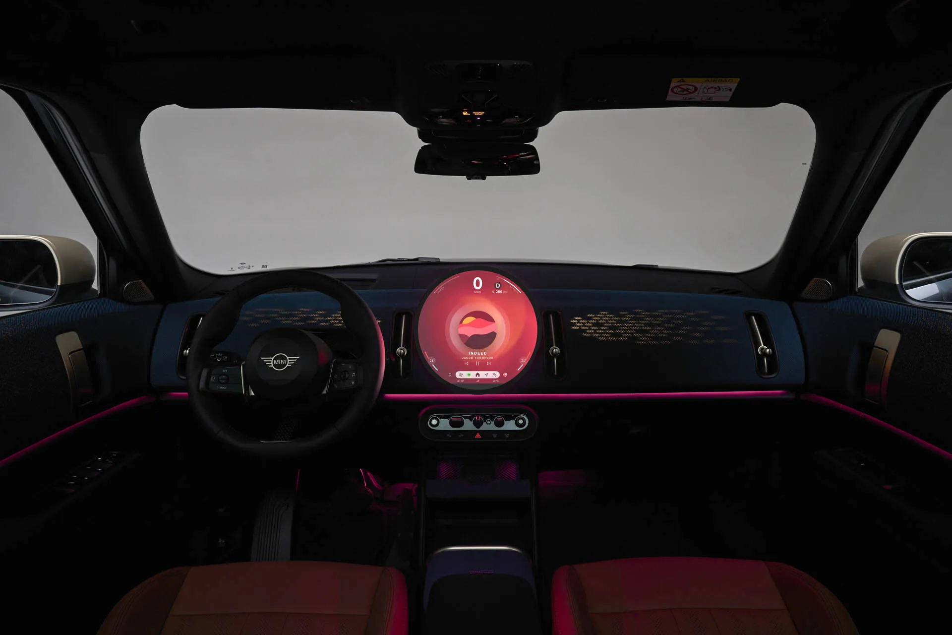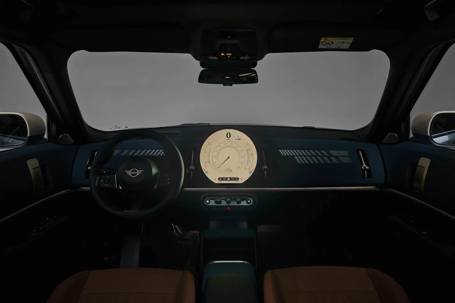 ภายในทุกอย่างดูเรียบง่ายกว่าเมื่อเทียบกับ MINI ในอดีต พื้นผิวที่เป็นผ้าทอ และเทคโนโลยีล่าสุด จอแสดงผล OLED แบบวงกลมขนาด 9.4 นิ้วที่ติดตั้งไว้ตรงกลางพร้อมขอบจอบางนั้นทำหน้าที่เป็นหน้าจอสัมผัสระบบสาระบันเทิง แผงหน้าปัดดิจิตอลเป็นสองเท่า มันทำงานบน ระบบปฏิบัติการ Mini 9 ที่ใช้ระบบปฏิบัติการ Androidผสานรวมผู้ช่วยเสมือนที่ใช้ AI ชื่อ Spike รองรับ 8 โหมดที่สร้างบรรยากาศภายในที่ซับซ้อน