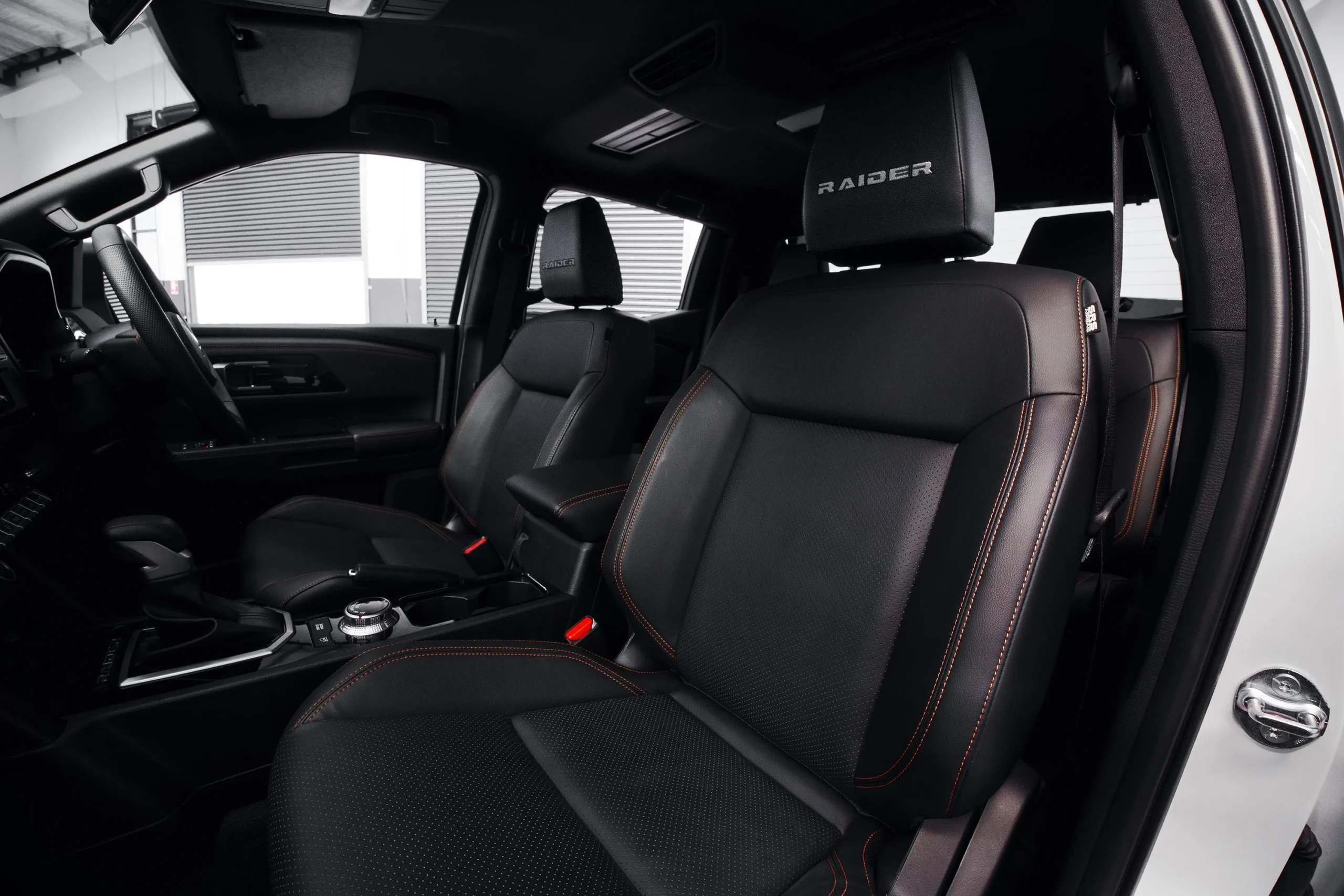 - ล้อและยาง: ถอดล้อขนาด 18×7.5 นิ้วเดิมออก แล้วแทนที่ด้วยล้ออัลลอยจาก ROH ขนาด 18×9.0 นิ้ว ที่กว้างขึ้น ทำสีพิเศษ Brushed Bronze พร้อมฝาครอบดุมล้อโลโก้ Raider และปรับค่าออฟเซ็ตใหม่ ช่วยเพิ่มความกว้างฐานล้อ (Track width) อีก 20 มิลลิเมตร รัดด้วยยาง All-terrain รุ่น Bridgestone Dueler A/T 002 ขนาด 285/60