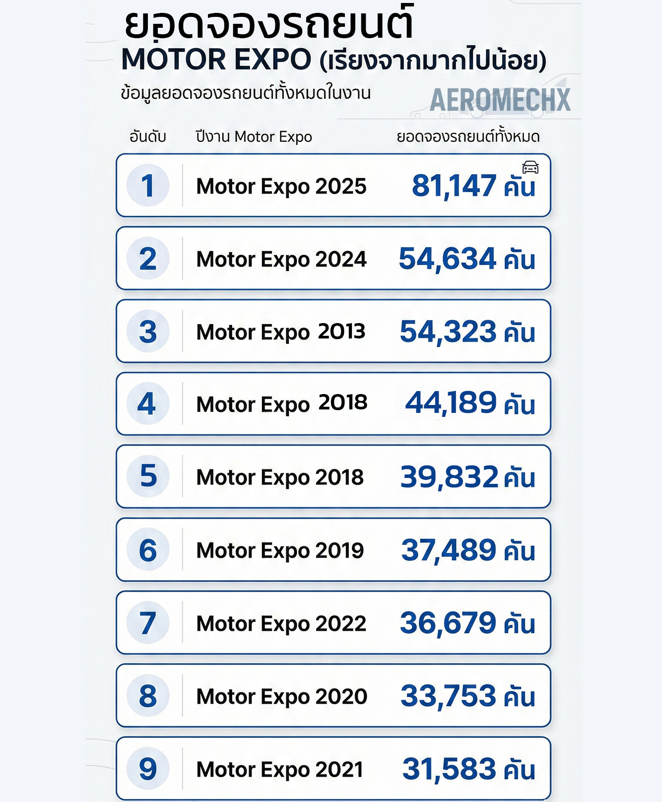 สรุปยอดจองรถยนต์ ในงาน MOTOR EXPO 2025 ระหว่าง 28 พฤศจิกายน – 10 ธันวาคม 2025 ระยะ 13 วัน (รวม 81,147 คัน) อิงจากผู้จัดงาน และ รายงานหน้างาน