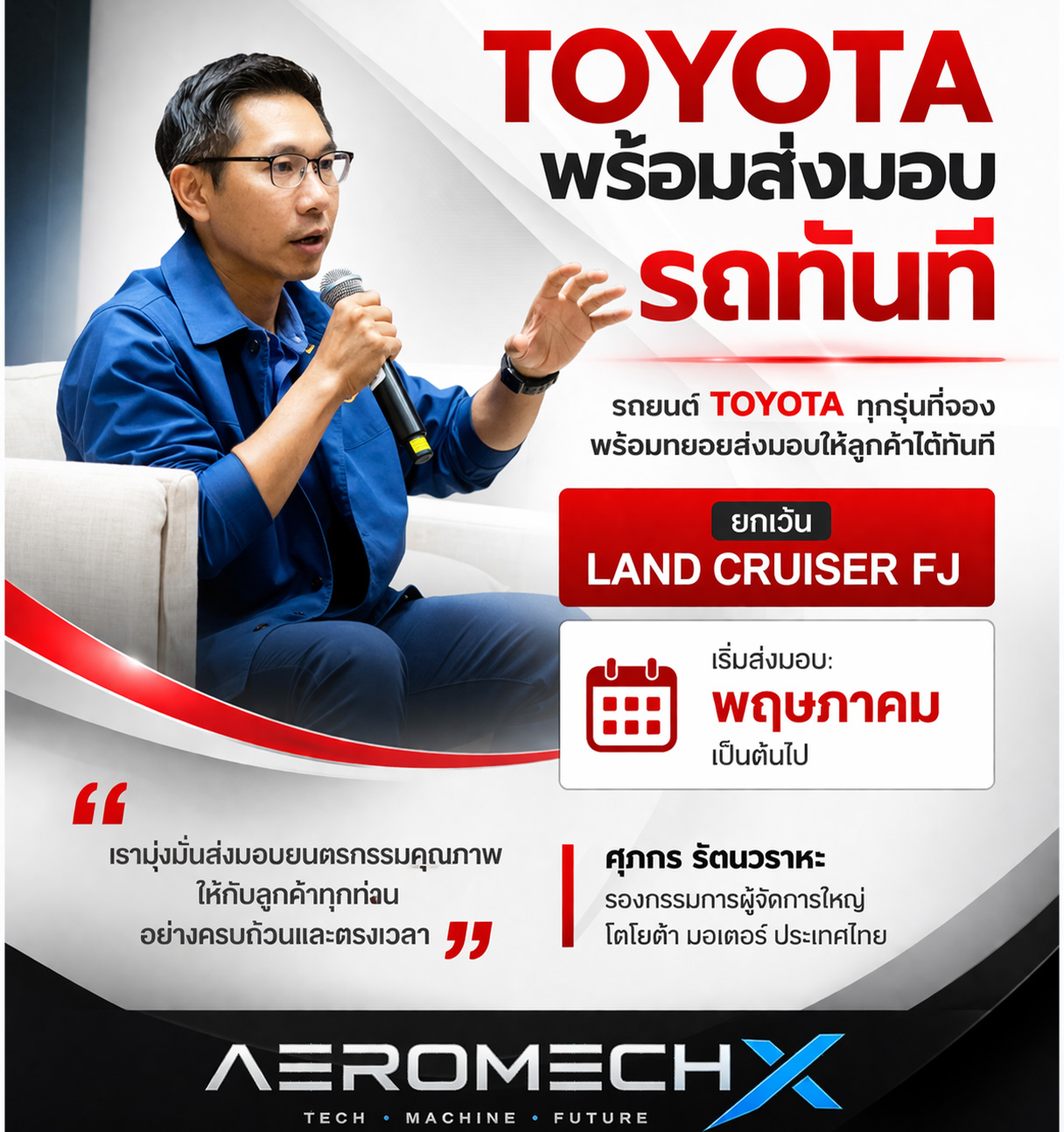 นายศุภกร รัตนวราหะ รองกรรมการผู้จัดการใหญ่ ย้ำชัดว่าโตโยต้าพร้อมส่งมอบรถทุกรุ่นให้กับลูกค้าทันที เพื่อให้มั่นใจว่าลูกค้าจะได้ใช้งานรถใหม่โดยไม่ต้องรอนาน ยกเว้นเพียงรุ่น Land Cruiser FJ ที่จะเริ่มส่งมอบได้ตั้งแต่เดือนพฤษภาคม 2569 เป็นต้นไป