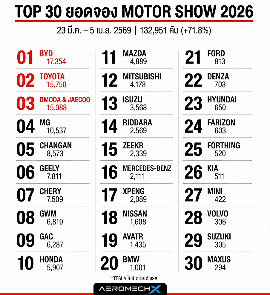 ตารางสรุปยอดจอง Motor Show 2026 รวม 132,951 คันระหว่าง 23 มีนาคม – 5 เมษายน 2569