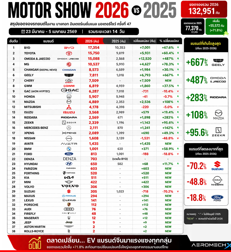 ตารางเปรียบเทียบยอดจอง Motor Show 2025 vs 2026 (ครบทุกแบรนด์)