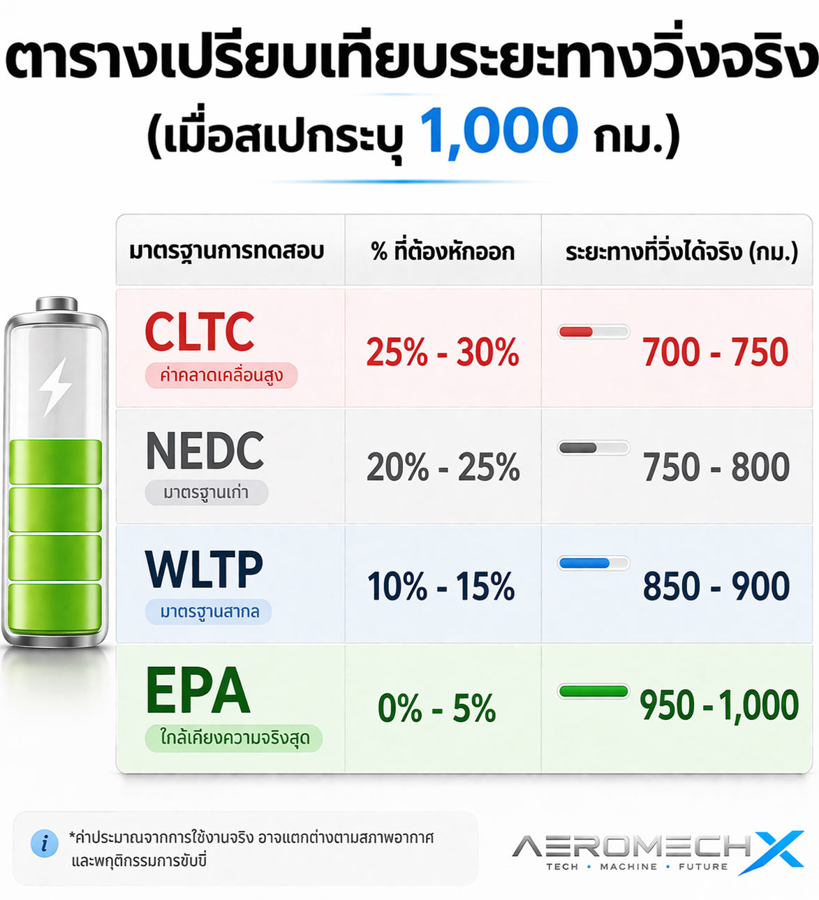 ในการเปรียบเทียบมาตรฐานต่างๆ หากเรายึดจากตัวเลข 1,000 กม. เป็นตัวตั้งต้นในทุกมาตรฐาน คุณจะเห็นความเข้มงวดที่แตกต่างกันอย่างชัดเจน โดยระยะทางที่วิ่งได้จริงจะแปรผันตามความเคี่ยวของแต่ละหน่วยงานทดสอบดังนี้ครับ