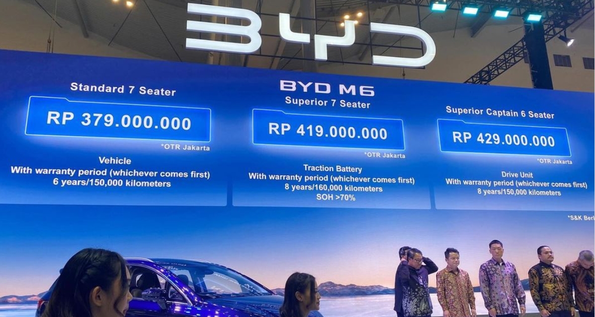 วันที่ 17 กรกฏาคม 2024 BYD อินโดนีเซีย ประกาศเปิดตัวอย่างเป็นทางการสำหรับ BYD M6 MPV ไฟฟ้าใหม่ 7 ที่นั่ง ราคาจำหน่าย RP 379,000,000 – 429,000,000 หรือประมาณ 830,000 – 940,000 บาท