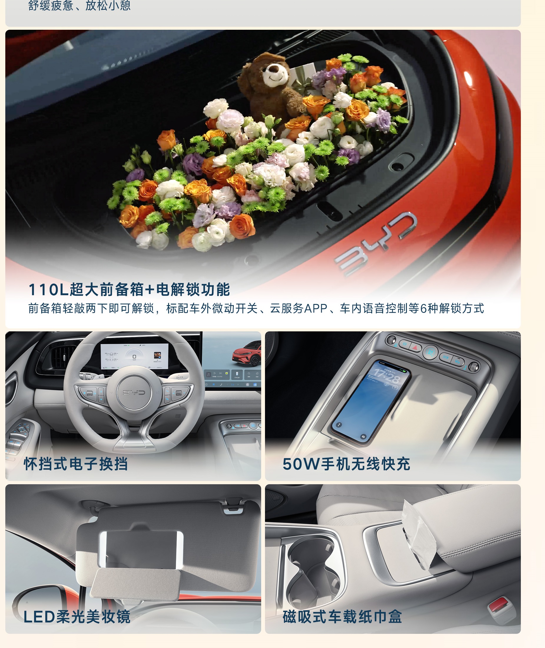 - พื้นที่เก็บสัมภาระด้านหน้า: มีช่องเก็บของด้านหน้า (Frunk) ขนาดใหญ่ความจุ 110 ลิตร (มากกว่ารุ่น DM-i ที่ไม่มีส่วนนี้)