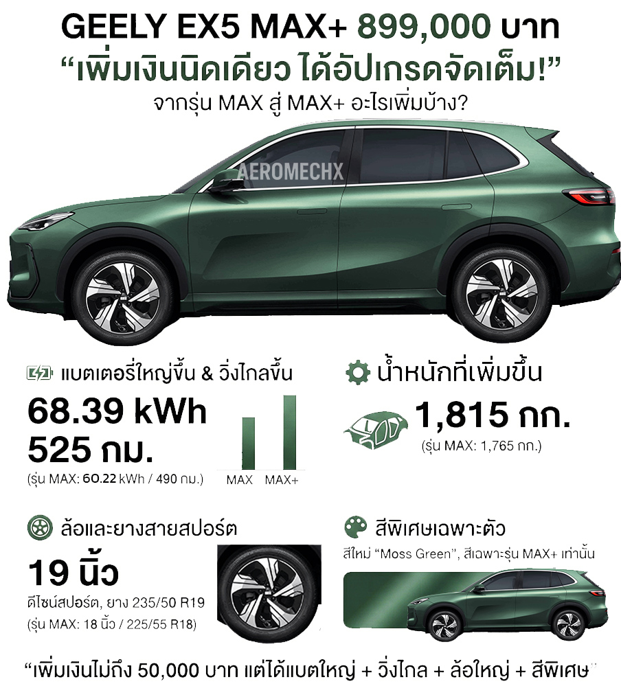 | GEELY EX5 รุ่น MAX+ (NEW) | 929,000 บาท | 899,000 บาท* (เฉพาะ 400 คันแรก) |