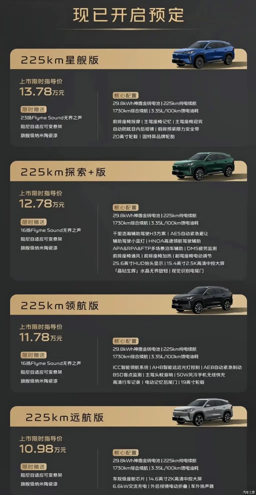 - เทคโนโลยีภายใน: ชิปประมวลผล Dragon Eagle 1, ระบบ Flyme Auto 2.0, หน้าจอกลาง 2.5K ขนาด 15.4 นิ้ว, ชาร์จมือถือไร้สาย 50W พร้อมพัดลมระบายอากาศ