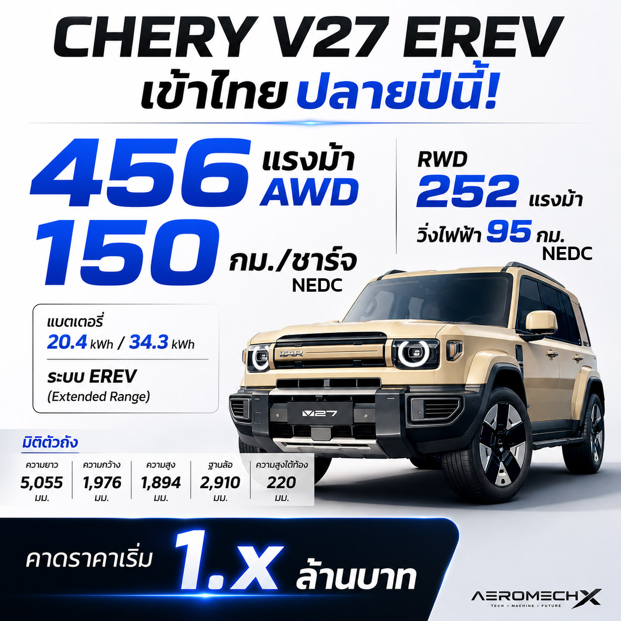 ยืนยันขายไทยปลายปีนี้ CHERY V27 EREV วิ่งไฟฟ้า 95-150 กม. NEDC ราคาล้านต้นๆ