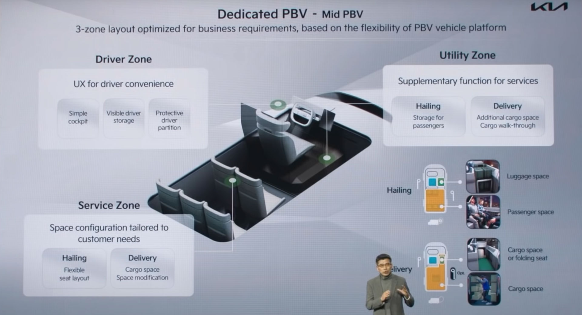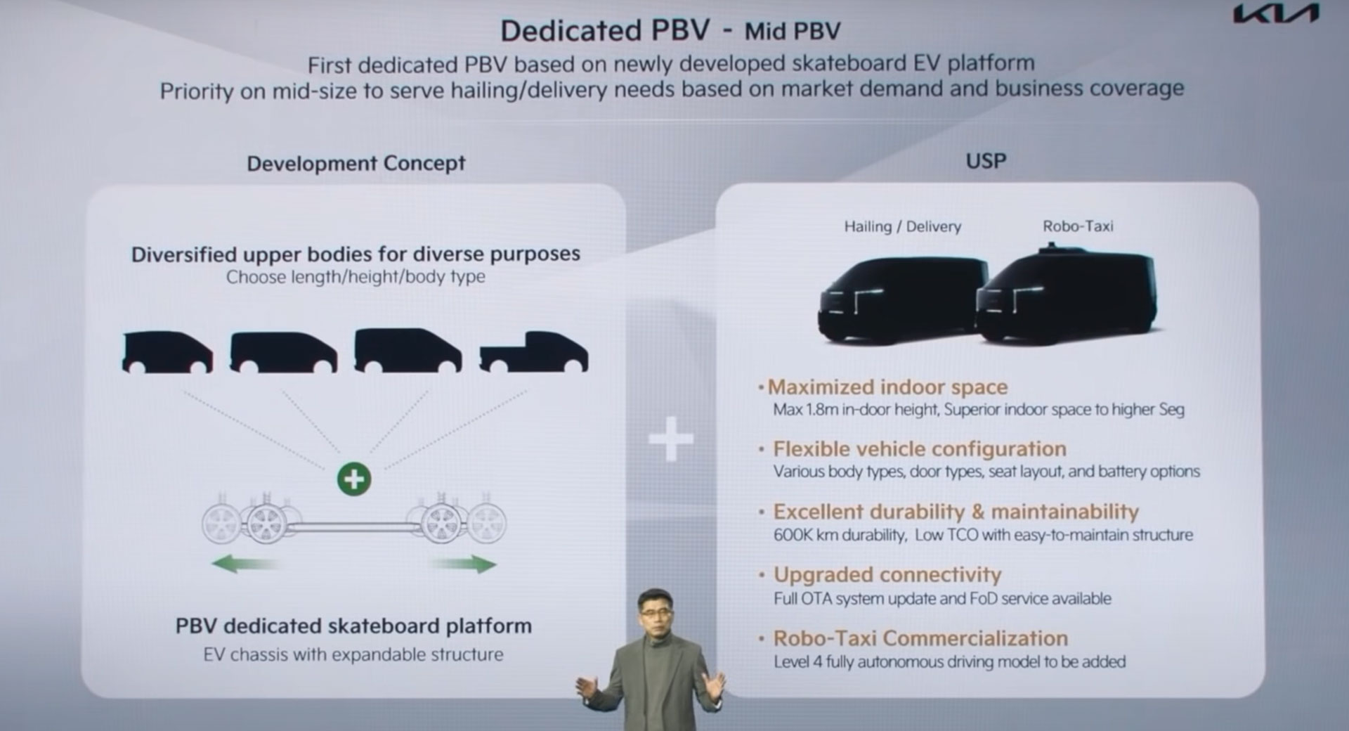 “เราตั้งเป้าที่จะเป็นบริษัทชั้นนำของโลกในตลาดรถยนต์ที่สร้างขึ้นตามวัตถุประสงค์” Song Ho-Sung ประธานเจ้าหน้าที่บริหารของ Kia กล่าวก่อนหน้านี้ นอกจาก PBV จำนวน 1 ล้านคันที่มีแผนจะสร้างในปี 2030 แล้ว Kia ยังตั้งใจที่จะผลิต EV สำหรับผู้โดยสารอีก 600,000 คัน