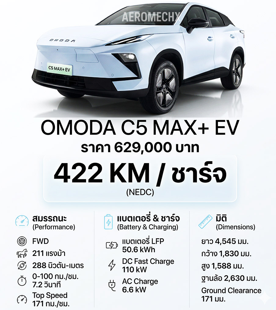 OMODA C5 EV Minorchange (2026) รุ่นประกอบไทย C5 EV Max Plus มาพร้อมกับการปรับจูนสมรรถนะใหม่ที่เน้นความคล่องตัวและการชาร์จที่รวดเร็วขึ้น ดังนี้: