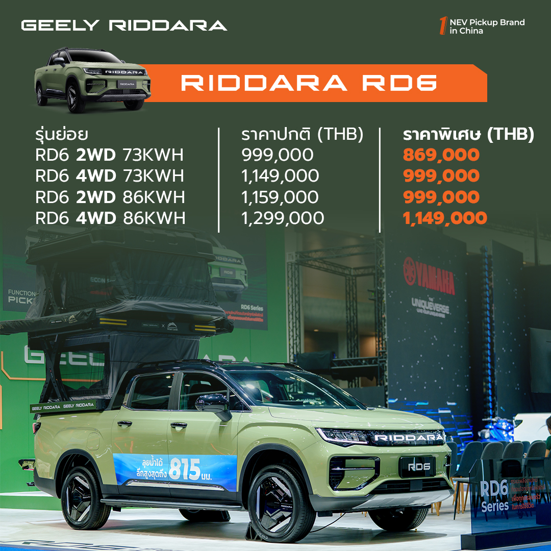 GEELY เดินเกมตลาด EV เชิงพาณิชย์ในไทยอย่างจริงจัง ด้วยการเปิดตัว RIDDARA RD6 รถกระบะไฟฟ้า 100% ที่พัฒนาบนแพลตฟอร์มของ Geely โดยเน้นทั้งการใช้งานจริงและไลฟ์สไตล์เอาท์ดอร์ พร้อมราคาที่ “เข้าถึงได้” เมื่อเทียบกับสมรรถนะและระยะทางวิ่ง