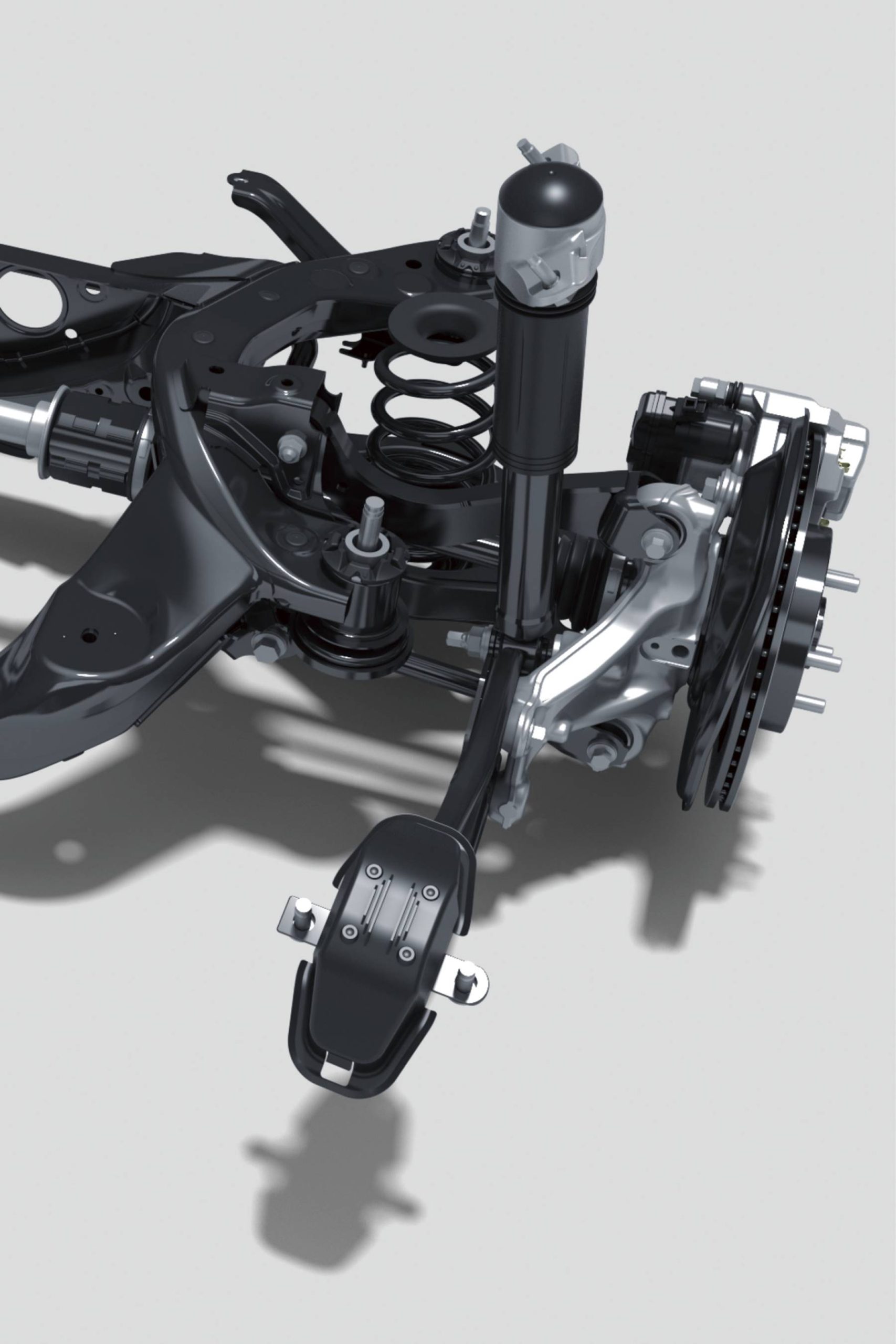 การใช้ระบบหลังแบบ Double Wishbone ช่วยควบคุมมุมล้อได้แม่นยำ ลดอาการย้วยตัวถังในโค้ง และรักษาหน้ายางสัมผัสพื้นถนนได้ดีกว่าแบบทอร์ชันบีมทั่วไป เหมาะกับแรงบิดสูงของรถ BEV