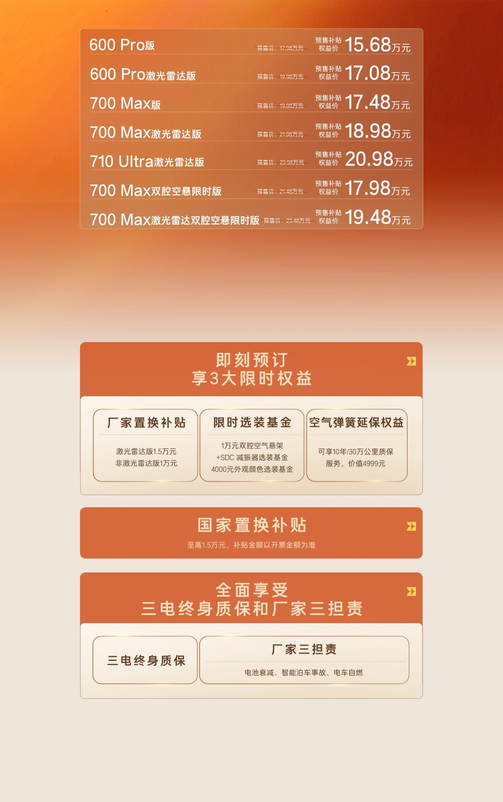 - กองทุนตัวเลือกเสริม: ส่วนลดออปชันช่วงล่างถุงลม 10,000 หยวน (45,820 บาท) และสีตัวถังสูงสุด 4,000 หยวน (18,328 บาท) รวมมูลค่าสูงสุด 14,000 หยวน (64,148 บาท)