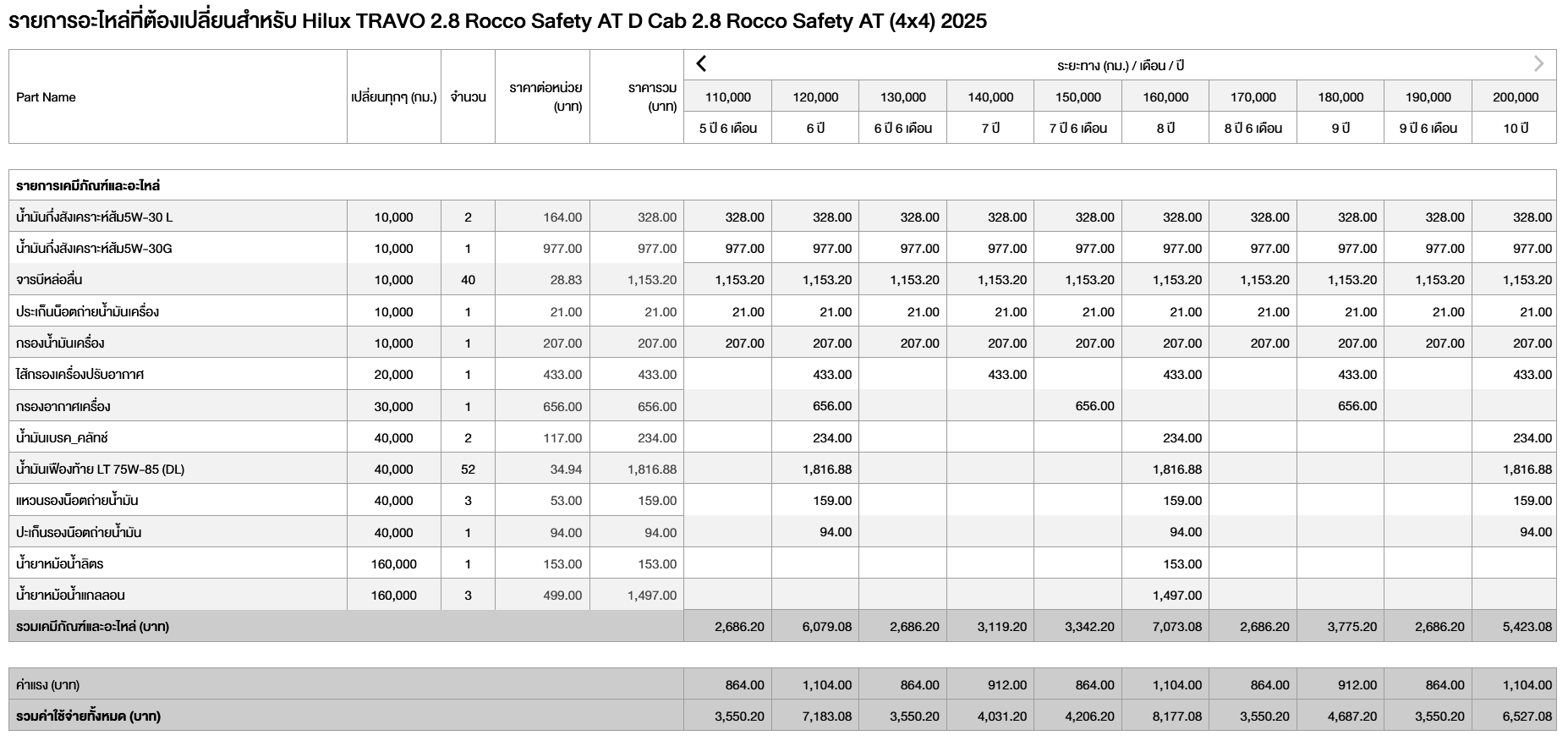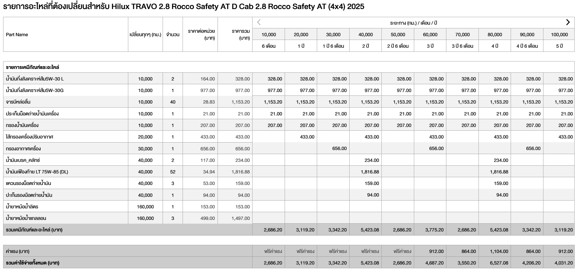 • ตลอด 10 ปี / 200,000 กม. ผู้ใช้ Toyota Hilux TRAVO 2.8 จะเสียค่าบำรุงรักษาตามระยะประมาณ ไม่ถึง 1 แสนบาท (92,975 บาท)