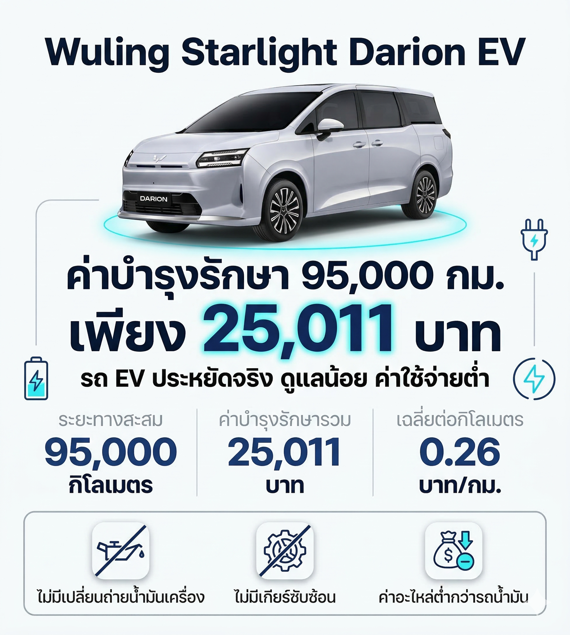 - Wuling Starlight Darion EV มาพร้อมการรับประกันโดย บริษัท อีวี ไพรมัส จำกัด ดังนี้