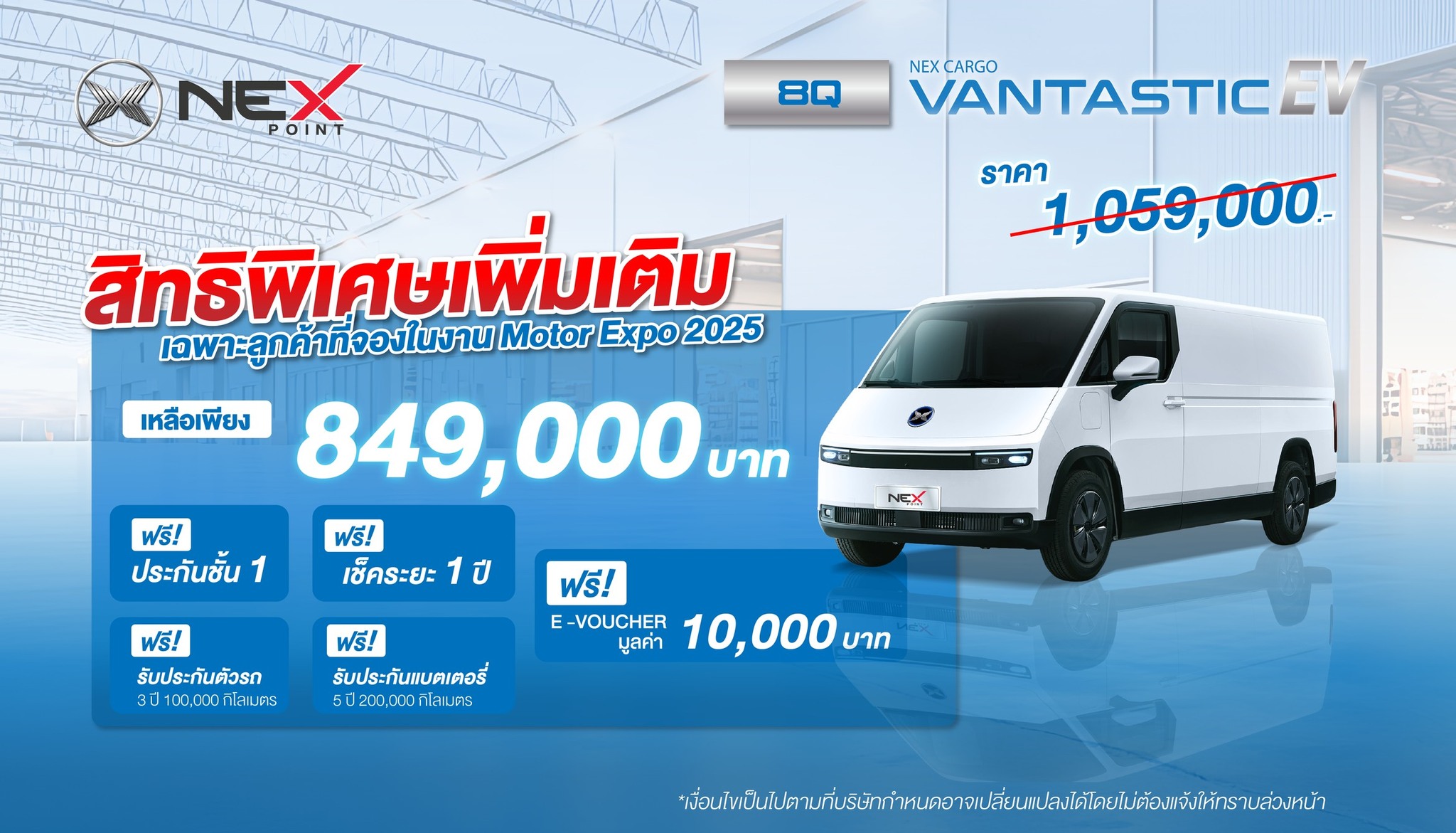 บริษัท เน็กซ์ พอยท์ จำกัด (มหาชน) ปลุกกระแสรถตู้ไฟฟ้าเชิงพาณิชย์ในไทยอีกครั้ง ด้วยการประกาศปรับลดราคาพิเศษสำหรับ NEX VANTASTIC CARGO VAN รุ่นใหม่ ขนาด 8 คิว เหลือเพียง 849,000 บาท จากราคาเดิม 1,059,000 บาท ลดทันที 210,000 บาท