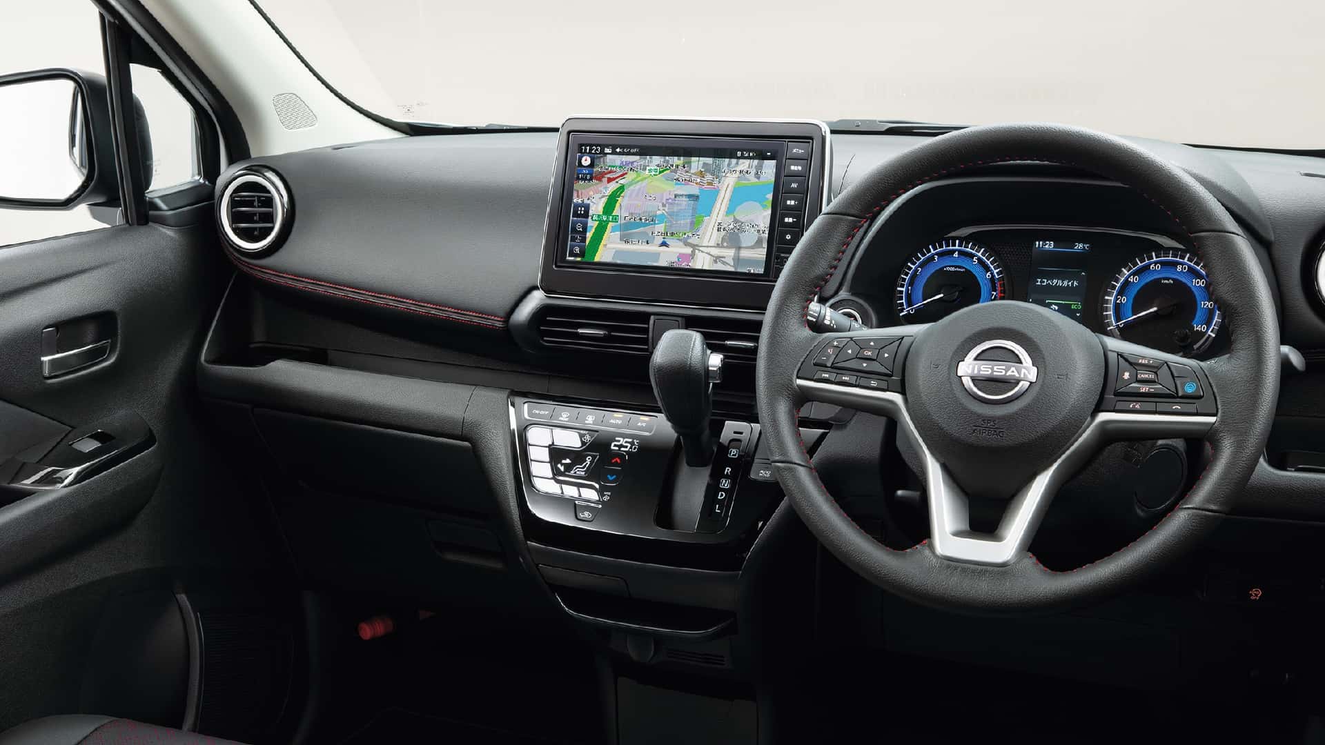 ภายในห้องโดยสาร มาพร้อมลายนูน Tricot สีดำเข้ม ซีรีส์ Highway Star G Turbo ใช้วัสดุคล้ายหนังแบบเจาะรูเน้นสีดำแบล็คเคอร์แรนท์ พื้นที่เบาะหลัง 650 มม. ระบบนำทางผ่านหน้าจอขนาด 9 นิ้ว หน้าปัดสี TFT LCD 4.2 นิ้ว