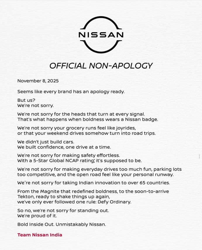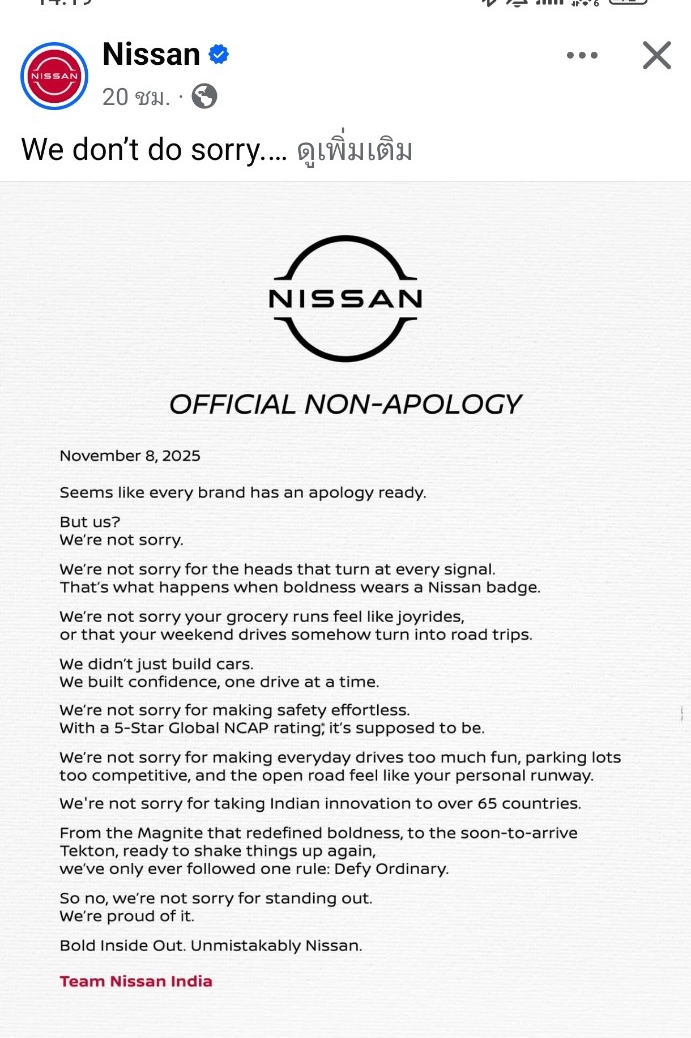 ในยุคที่แทบทุกแบรนด์ออกแถลงขอโทษกันเป็นเรื่องปกติ — ไม่ว่าจะเรื่องคุณภาพสินค้า, บริการ, หรือความผิดพลาดในโซเชียลมีเดีย Nissan India กลับเลือกเดินเกม “สวนกระแส” ด้วยแคมเปญจดหมายเปิดผนึกชื่อว่า Official Non-Apology หรือ “จดหมายไม่ขอโทษอย่างเป็นทางการ”