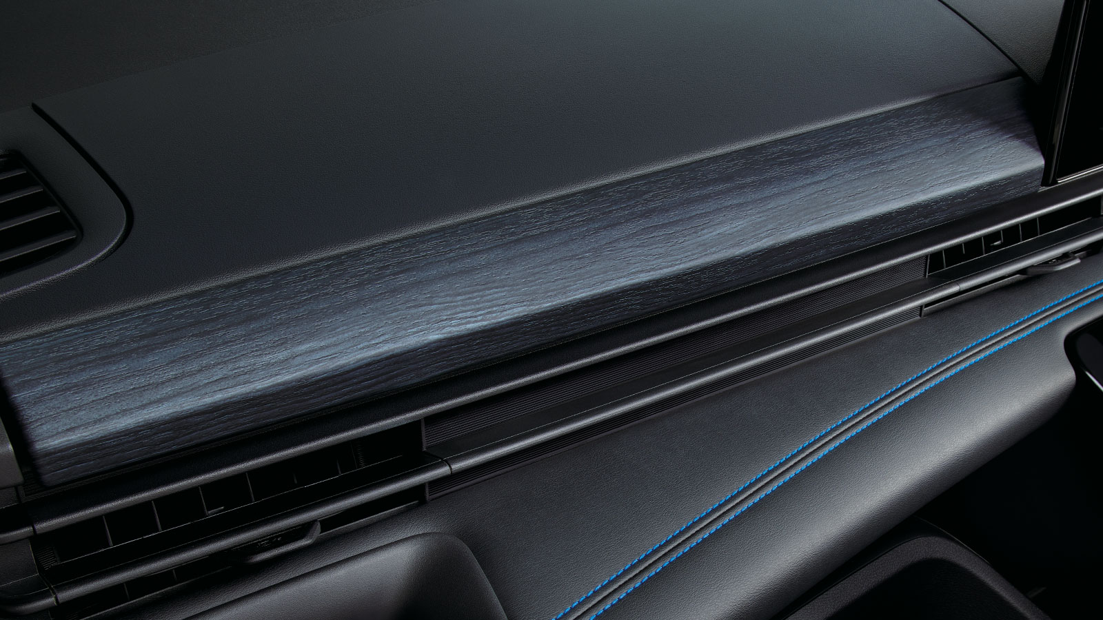 แผงหน้าปัดและแผงประตู ตกแต่งด้วยด้ายเย็บสีน้ำเงิน