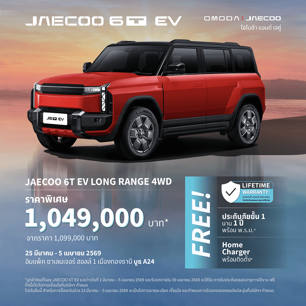 - JAECOO 6 EV LONG RANGE 4WD: ราคาพิเศษ 999,900 บาท (ลดจากปกติ 1,249,000 บาท)