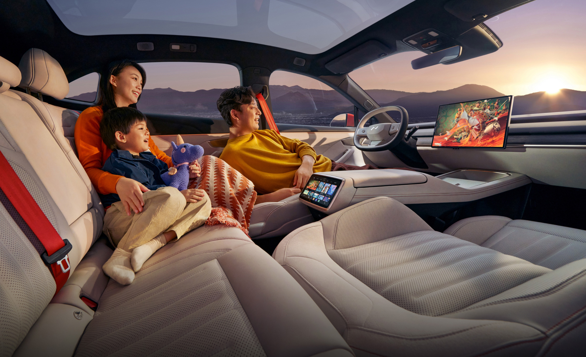 ภายในห้องโดยสารออกแบบพรีเมียม พวงมาลัยแบบ 3 ก้าน หน้าจอแสดงความปลอดภัยบนกระจกหน้ารถ HUD ขนาด 13 นิ้ว หน้าจอควบคุมส่วนกลางระดับเรตินา 3K ขนาด 17.2 นิ้ว (หน้าจอใช้มาตรฐานขอบเขตสี DCI-P3 โดยมี 10 – ความลึกของสีบิตและสามารถแสดงสีได้ 1.07 พันล้านสี หน้าจอมีความสว่างสูงสุดเกิน 12,000 nits และป้องกันแสงสะท้อน ป้องกันลายนิ้วมือ และป้องกันแสงสะท้อน ในเวลาเดียวกันทั้งสามด้านของหน้าจอก็เท่ากัน 5.35 มม.) และมีอัตราส่วนการนำเสนอ 16:10 ด้วยการออกแบบคอนโซลกลางสไตล์มินิมอล และหน้าจอความบันเทิงด้านหลังขนาด 8 นิ้ว หน้าจอควบคุมส่วนกลางใช้การออกแบบขอบจอที่แคบเป็นพิเศษ และพื้นที่แสดงผลเป็น 1.25 เท่าของ Tesla Model Y ห้องโดยสารปูด้วยวัสดุเพื่อสุขภาพแม่และเด็กขนาด 15 ตารางเมตร เพื่อปกป้องสุขภาพของสมาชิกในครอบครัว