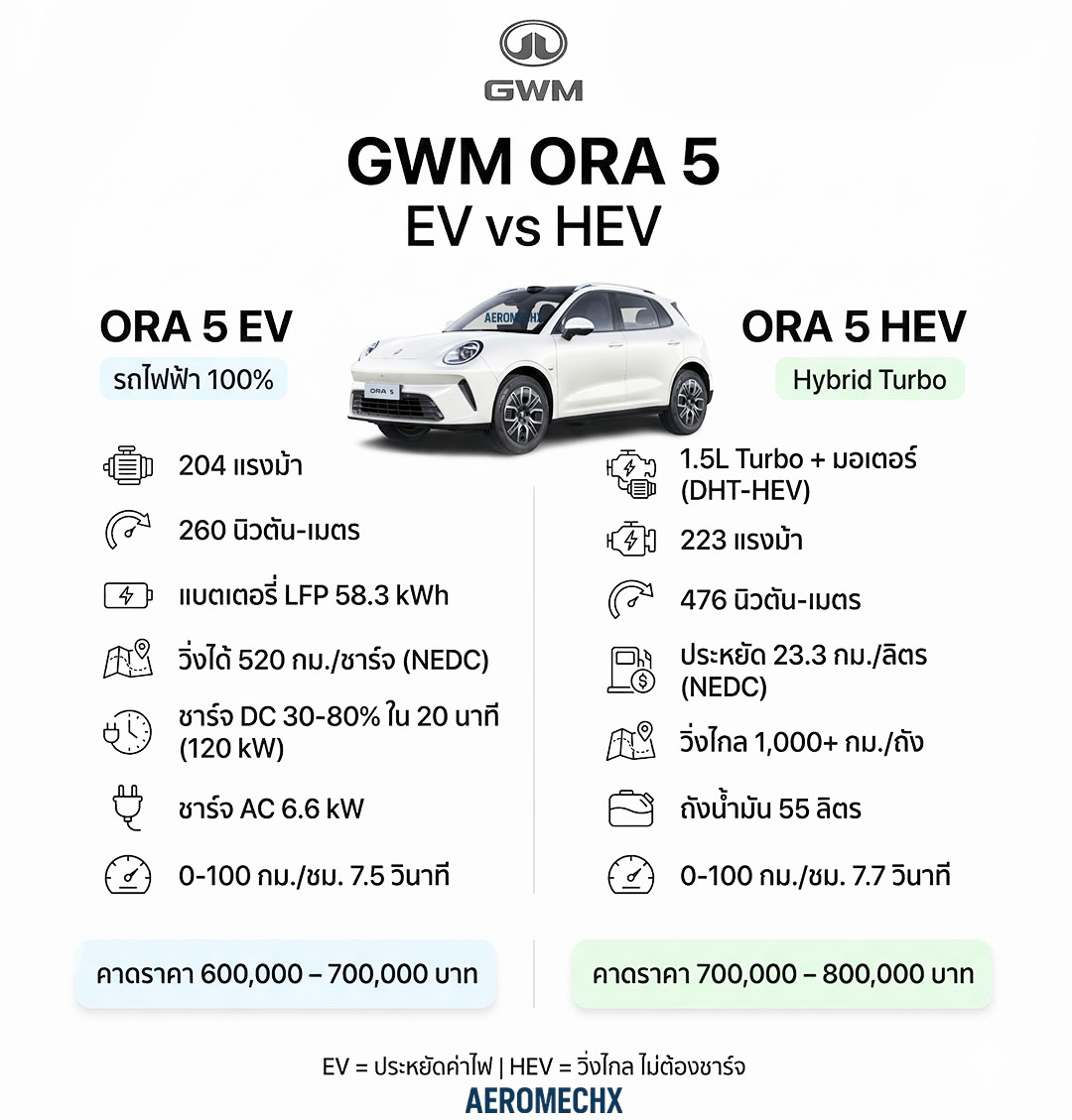 | หัวข้อ | GWM ORA 5 SUV EV | GWM ORA 5 SUV HEV |