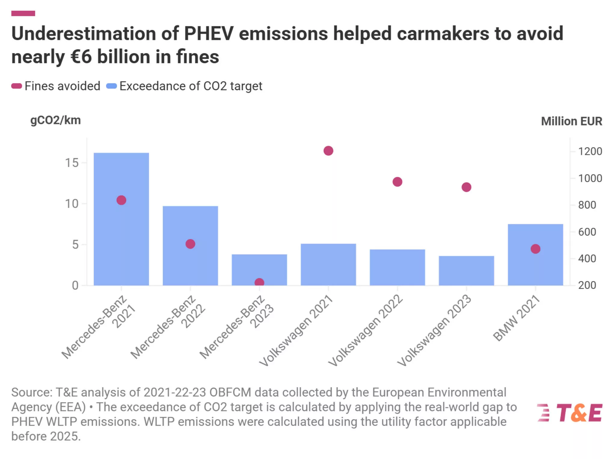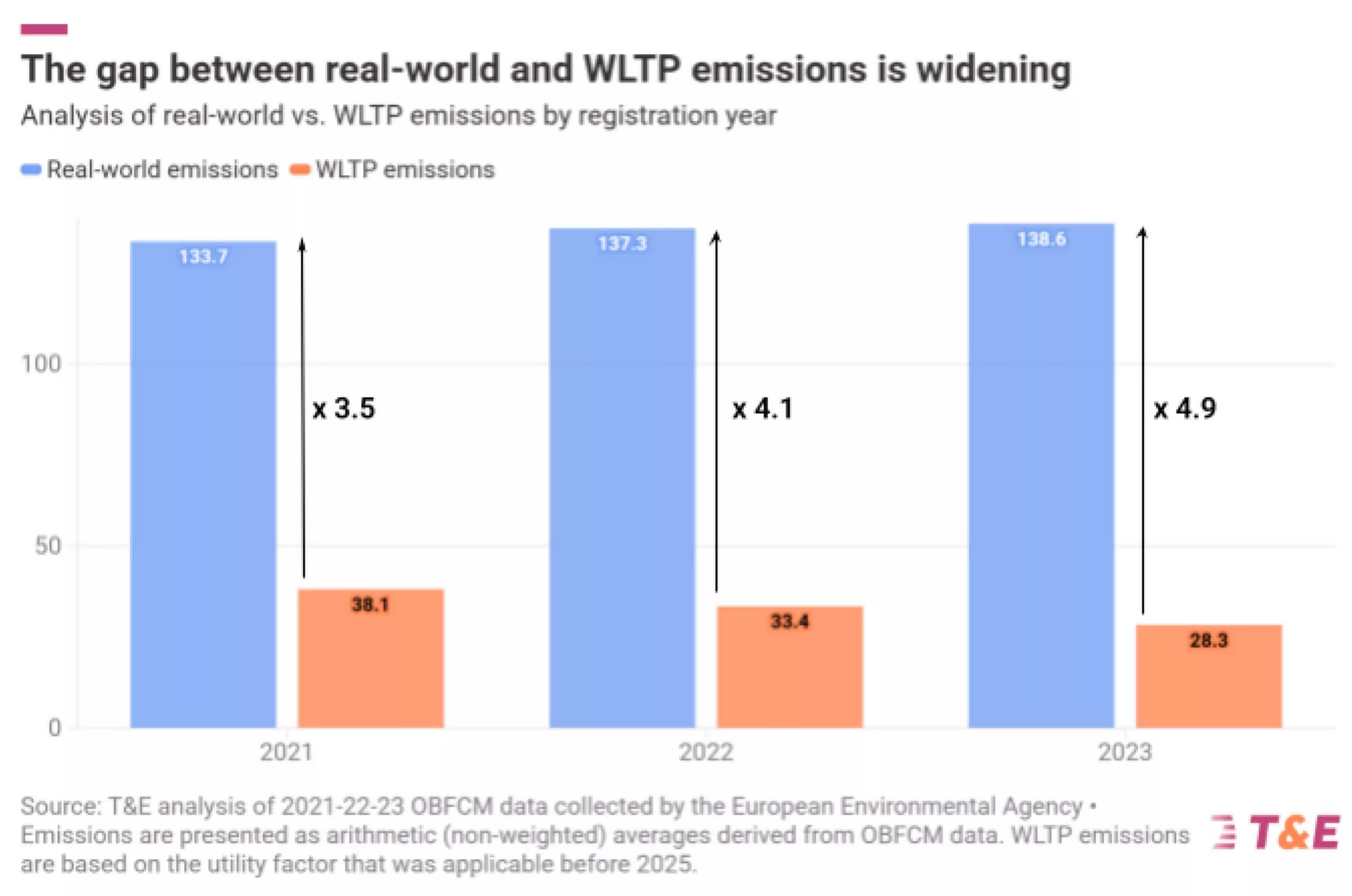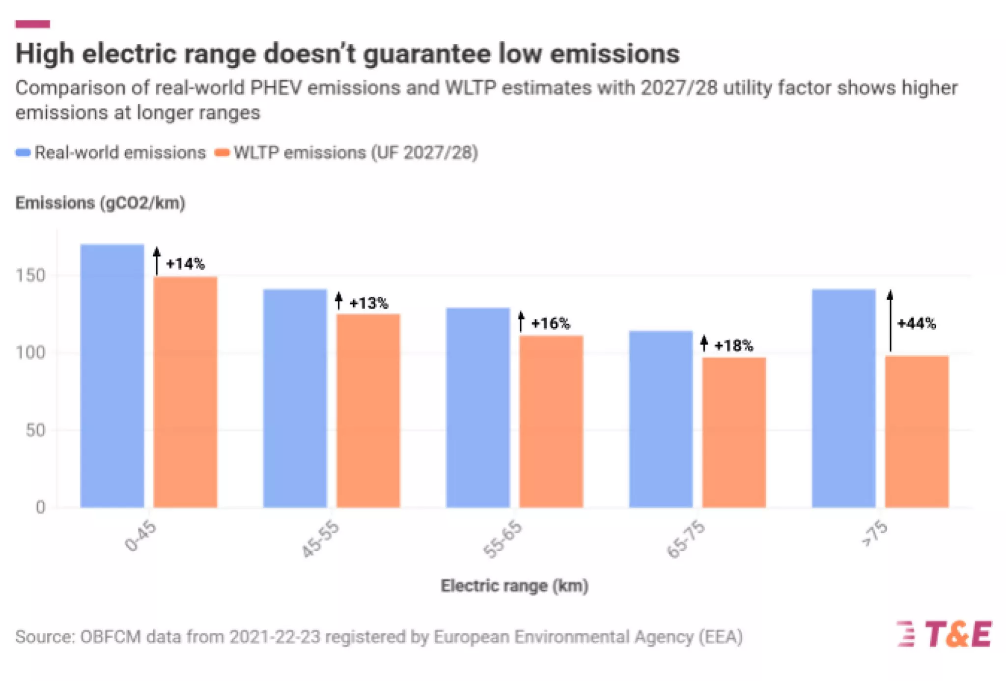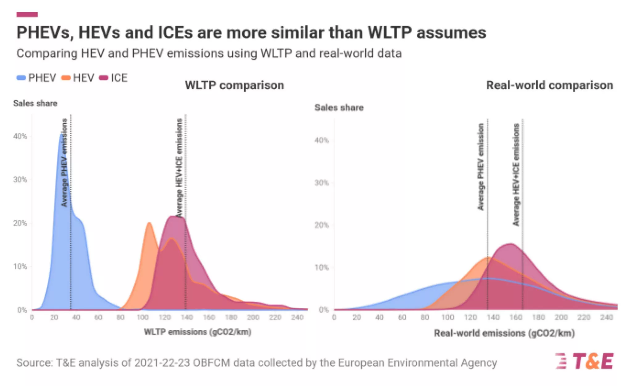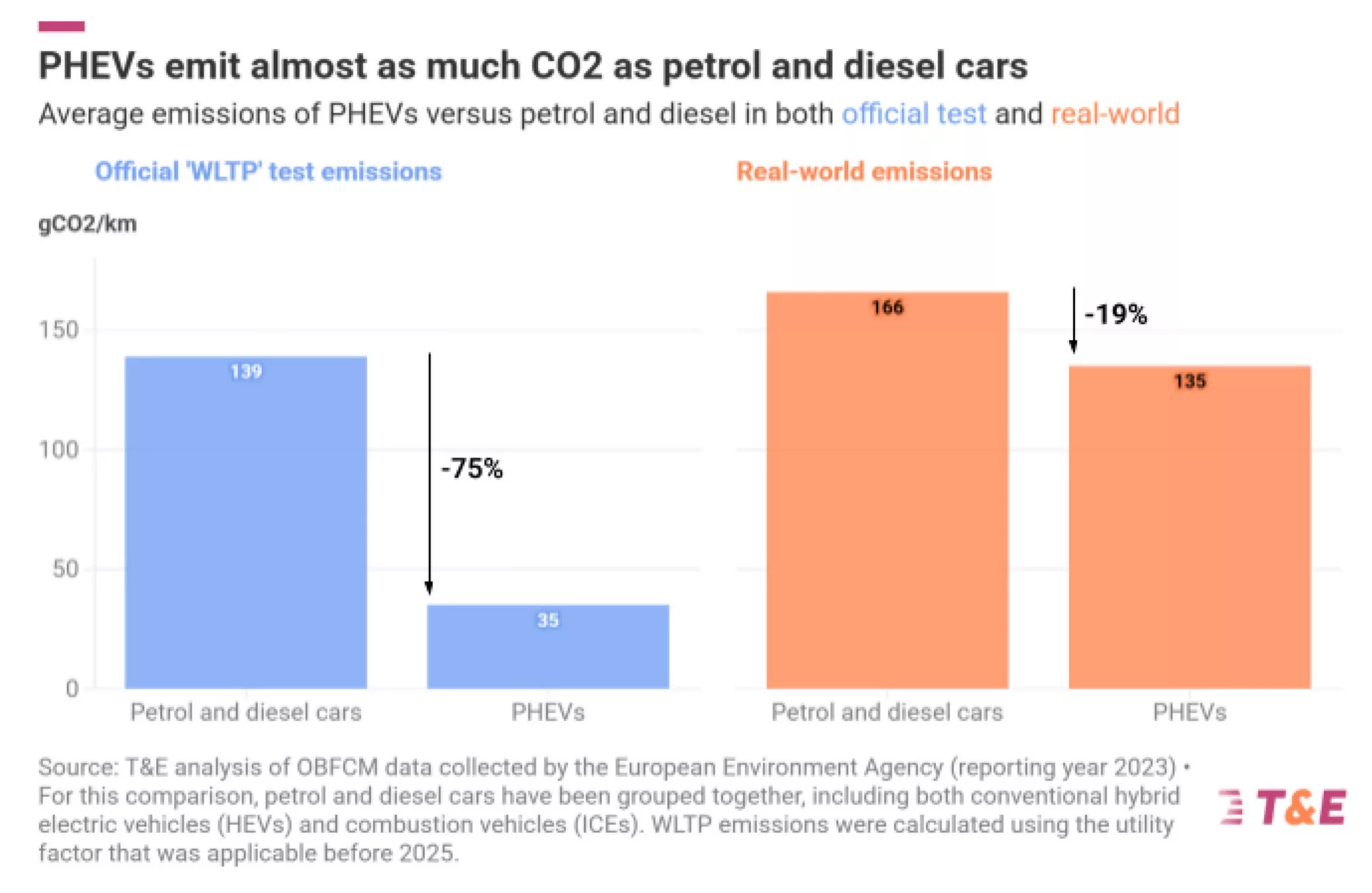 ในปี 2021 T&E เคยรายงานว่า รถ PHEV ปล่อย CO₂ จริงอยู่ที่ 134 กรัมต่อกิโลเมตร ในขณะที่ค่าทดสอบมาตรฐาน (WLTP) ของผู้ผลิตอยู่เพียง 38 กรัมต่อกิโลเมตร