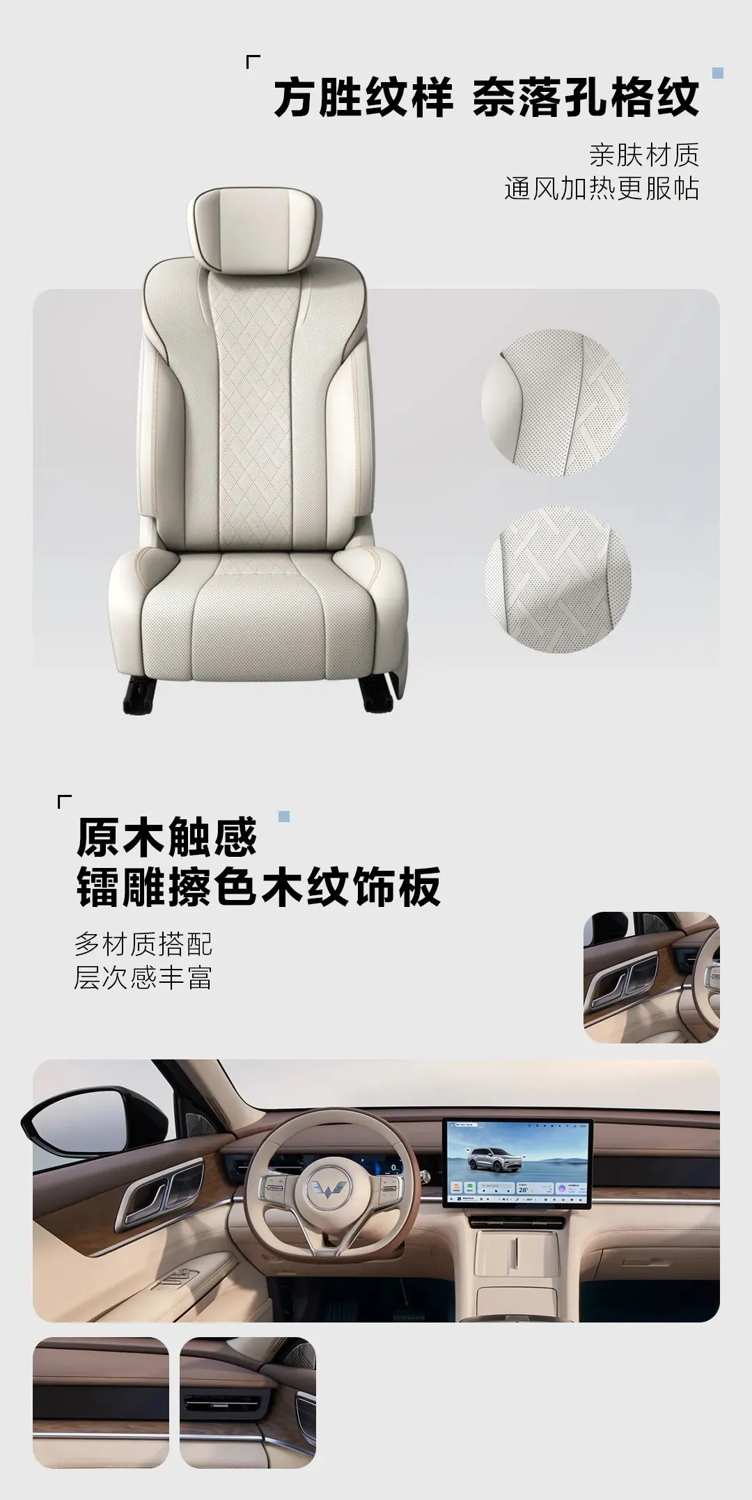 - แผงคอนโซลลายไม้: ใช้เทคโนโลยีแกะสลักด้วยเลเซอร์และทำสี เพื่อให้สัมผัสที่เหมือนไม้จริงมากที่สุด