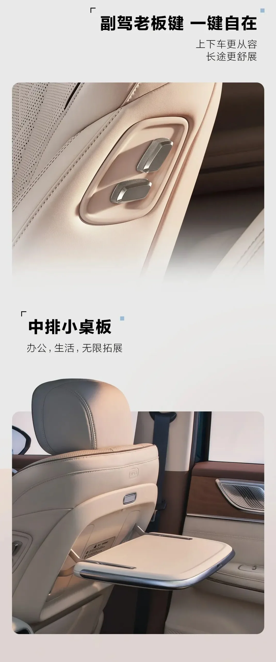 - ความสะดวกสบายระดับ VIP: มี “ปุ่มบอส” (Boss Button) ที่ด้านข้างเบาะผู้โดยสารตอนหน้า ช่วยให้คนนั่งแถวสองสามารถเลื่อนเบาะหน้าออกไปได้ด้วยปุ่มเดียว เพิ่มพื้นที่วางขา และยังมาพร้อม โต๊ะพับอเนกประสงค์ สำหรับผู้โดยสารแถวที่ 2 อีกด้วย
