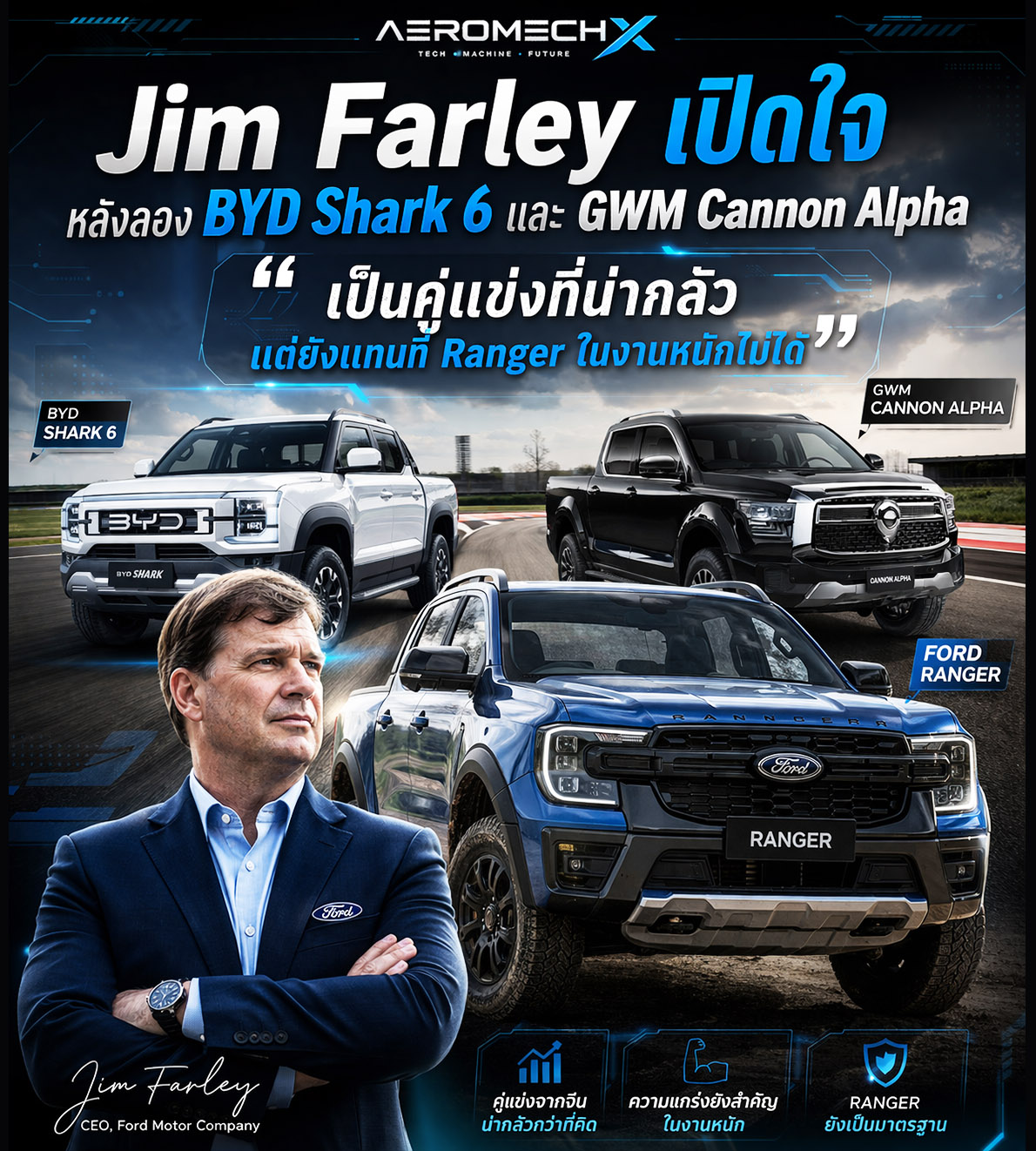 “Jim Farley” แม่ทัพ Ford เปิดใจหลังลองขับ BYD Shark 6 และ GWM Cannon Alpha: “เป็นคู่แข่งที่น่ากลัว แต่ยังแทนที่ Ranger ในงานหนักไม่ได้”