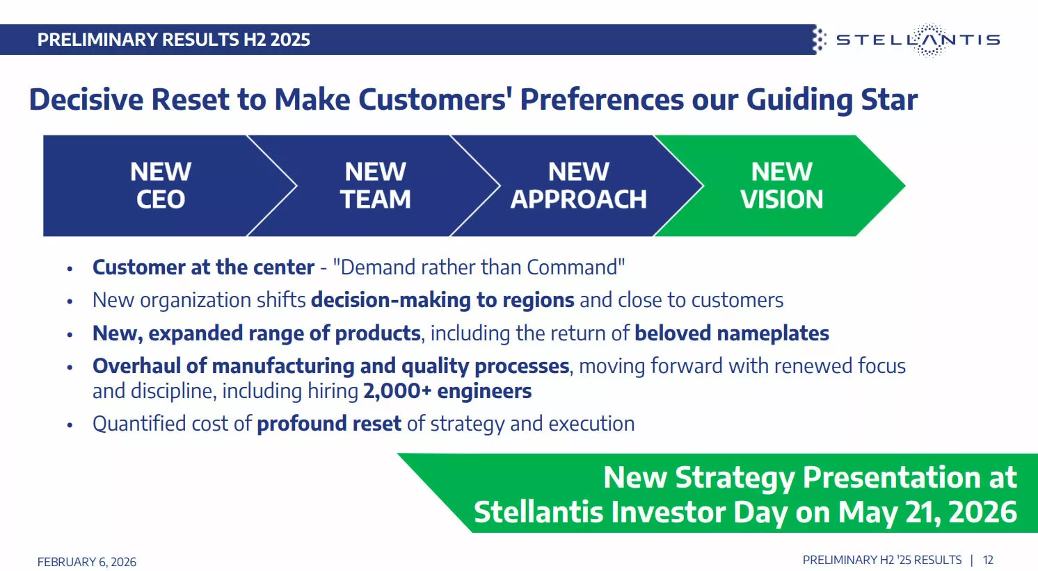 CEO คนปัจจุบัน Antonio Filosa ระบุว่า การรีเซ็ตครั้งนี้เป็นส่วนหนึ่งของกระบวนการที่เริ่มตั้งแต่ปี 2025 เพื่อทำให้ “ความต้องการของลูกค้า” กลับมาเป็นศูนย์กลางของการตัดสินใจอีกครั้ง โดยยอมรับว่า ค่าใช้จ่ายก้อนใหญ่สะท้อน “ต้นทุนของการประเมินความเร็วการเปลี่ยนผ่านสู่พลังงานใหม่สูงเกินจริง” จนทำให้บริษัทห่างจากความต้องการ กำลังซื้อ และความต้องการใช้งานจริงของผู้บริโภคในหลายตลาด