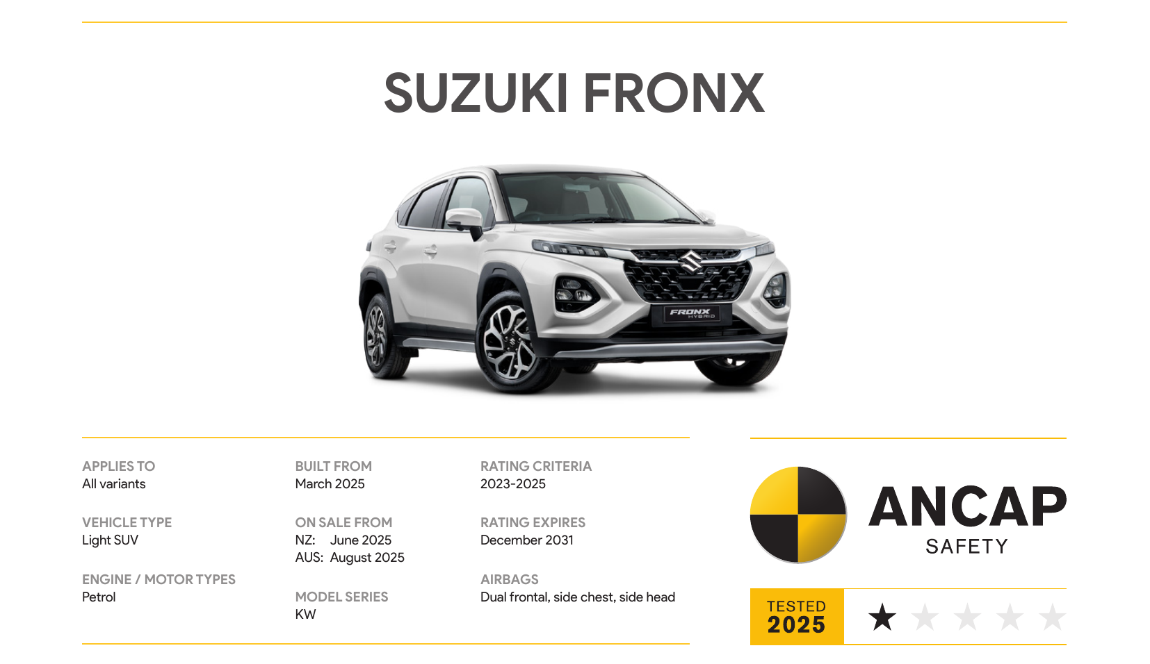 รถยนต์ Suzuki Fronx รุ่นปี 2026 ได้รับคะแนนความปลอดภัยจากการชนเพียงหนึ่งดาวจากโครงการประเมินความปลอดภัยรถยนต์ใหม่แห่งออสเตรเลีย (ANCAP) ซึ่งเป็นหนึ่งในคะแนนที่ต่ำที่สุดที่เคยบันทึกไว้สำหรับรถยนต์ขนาดเล็ก และเป็นคะแนนที่ต่ำที่สุดในบรรดารถยนต์ทุกรุ่นที่วางจำหน่ายอยู่ในออสเตรเลียในปัจจุบัน