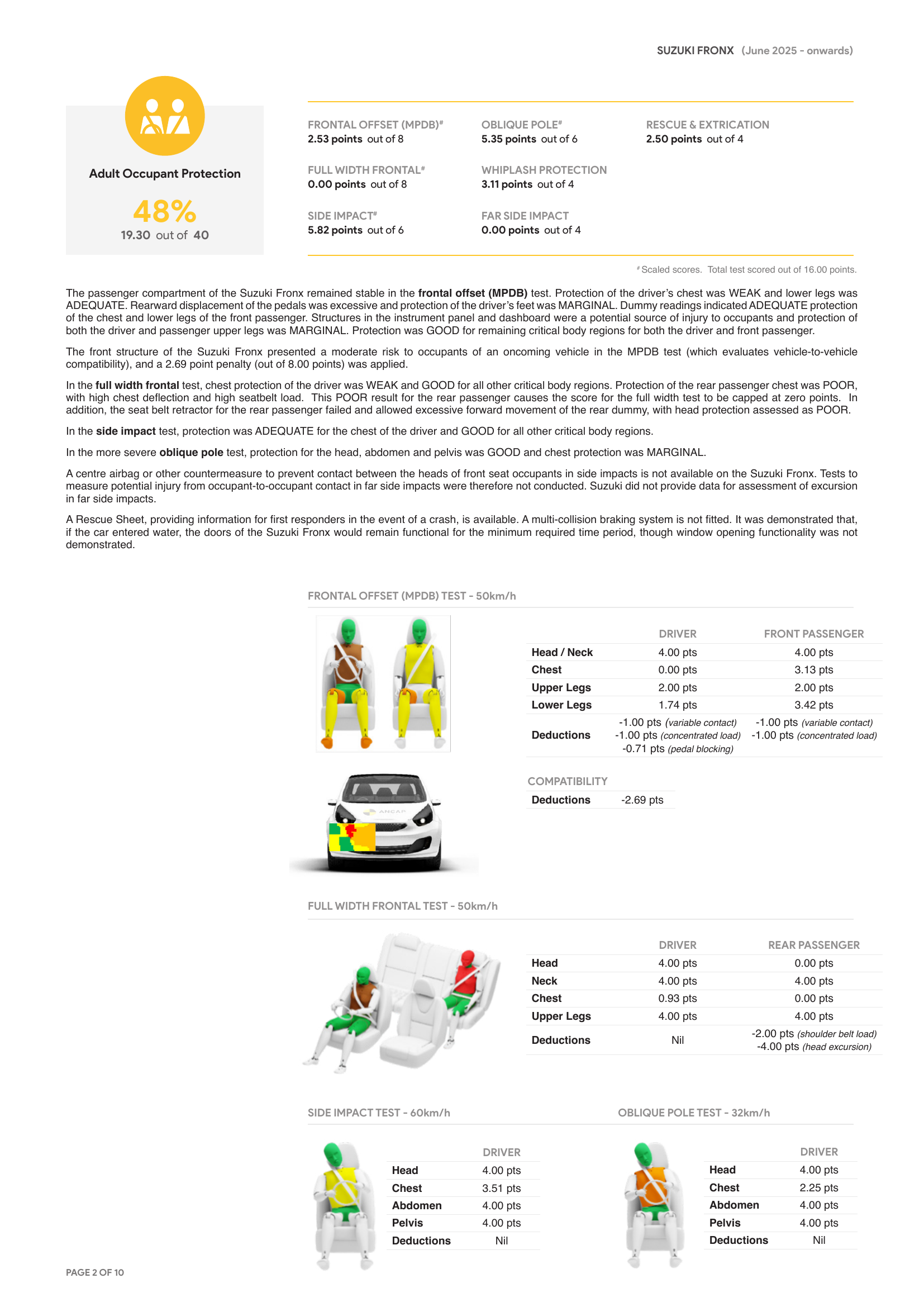 แม้โครงสร้างห้องโดยสารของ Suzuki Fronx จะยังคงรูปได้ดีในการชนเยื้อง (MPDB) แต่ผลกระทบต่อร่างกายผู้โดยสารยังสูงกว่าที่ควรจะเป็น
