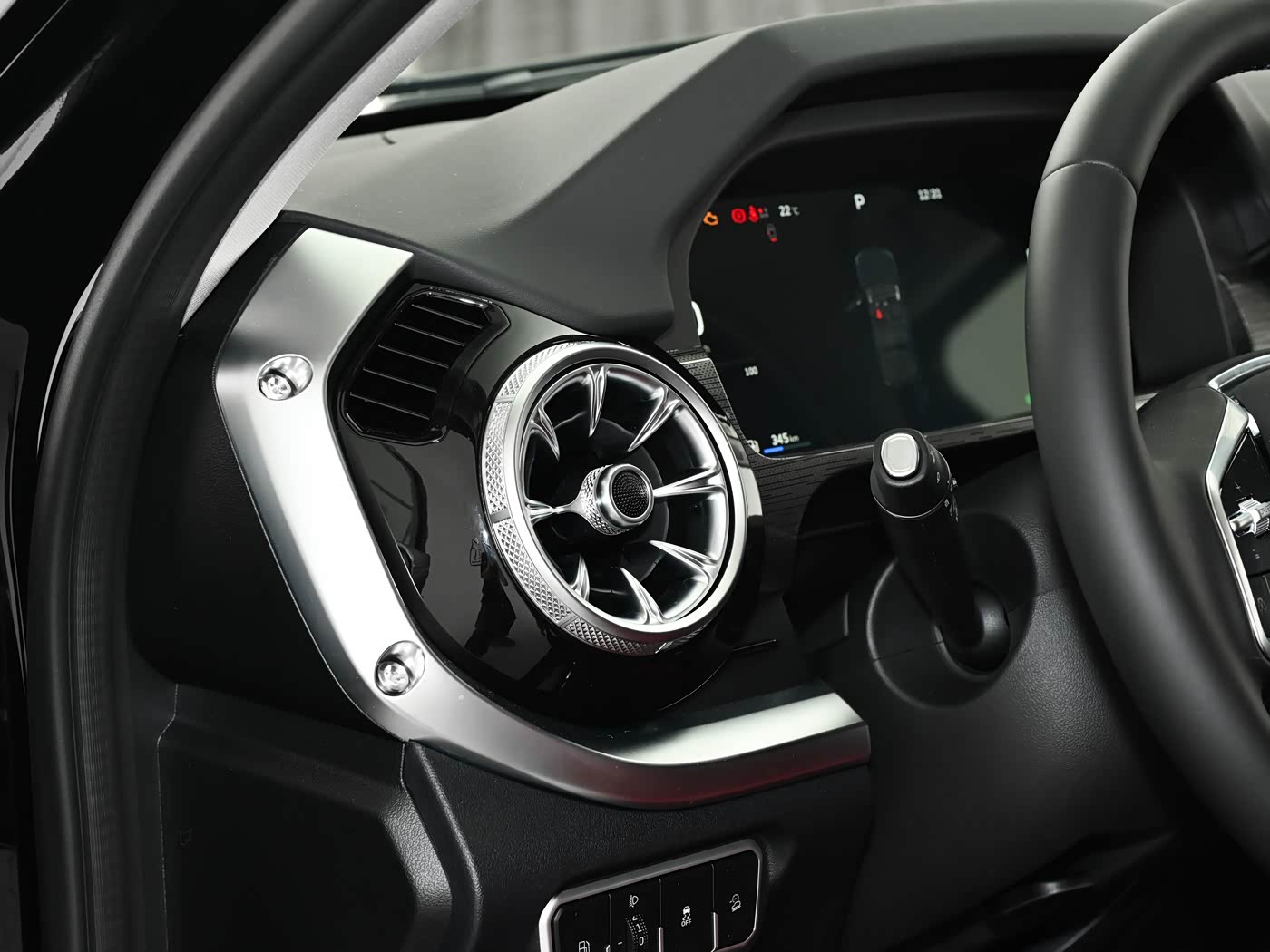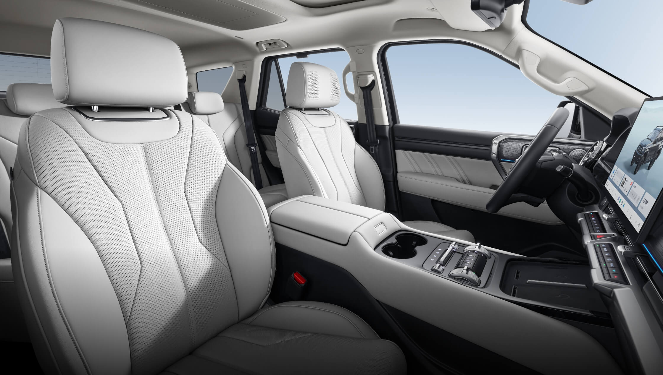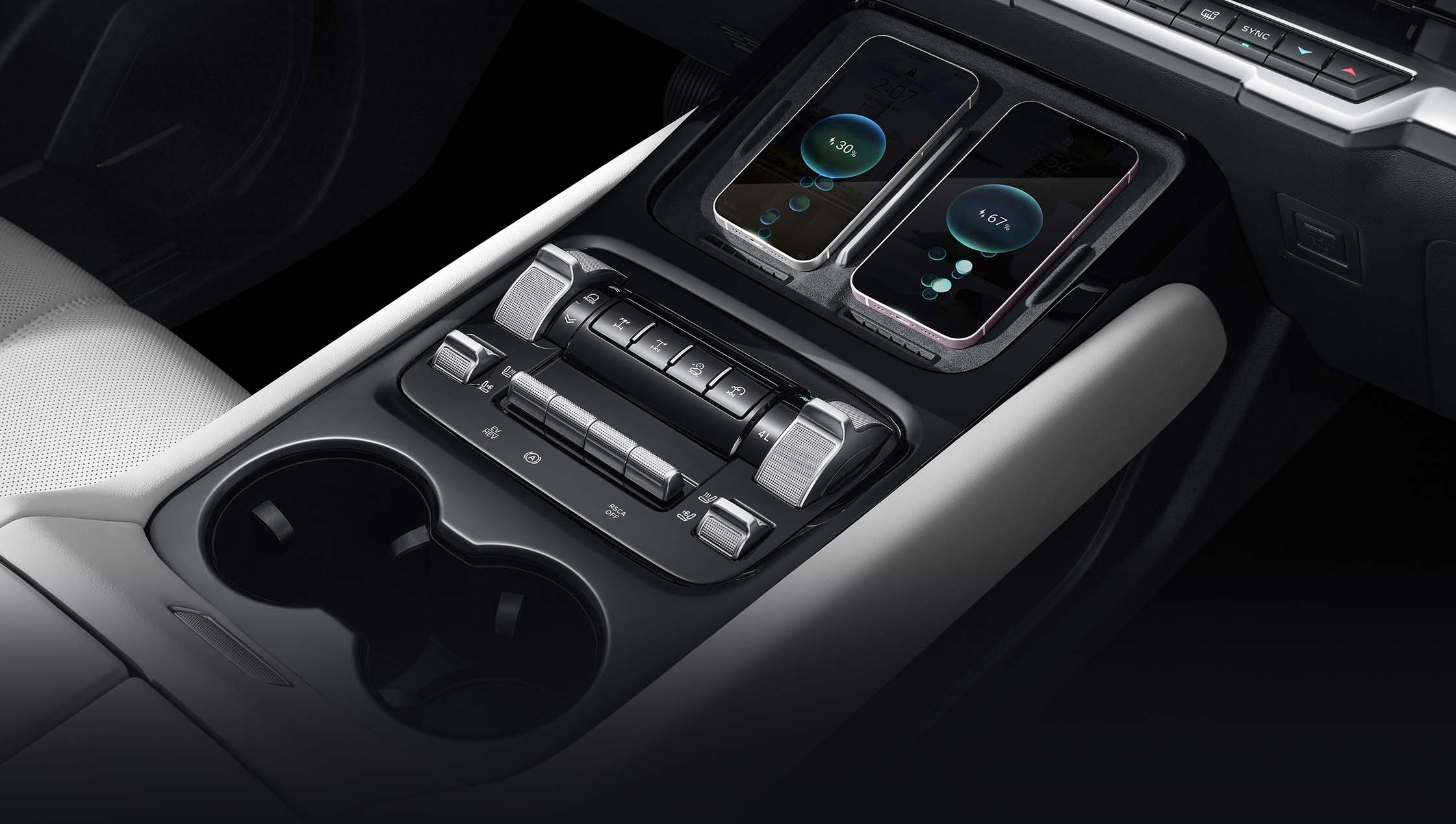 เพิ่มคันเกียร์แบบ “คอพวงมาลัย” ทำให้คอนโซลกลางโล่งขึ้น และแบ่งโซนชัดเจน ชาร์จไร้สายคู่ → ปุ่มควบคุมออฟโรดโลหะ → ช่องแก้วน้ำ