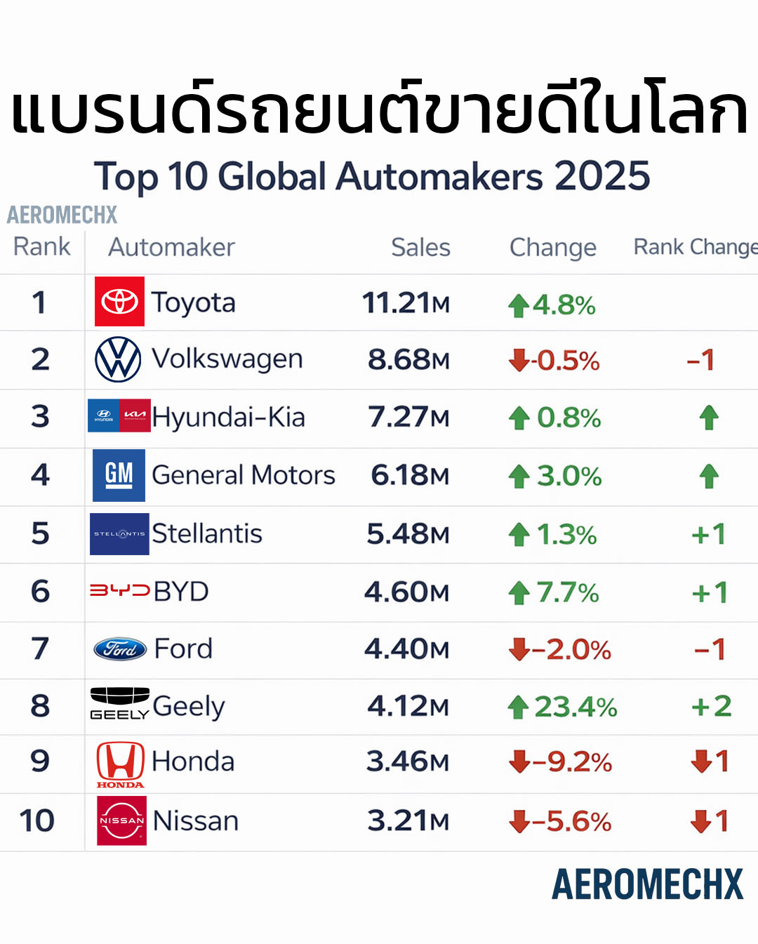 ตาราง 10 อันดับผู้ผลิตรถยนต์โลก ปี 2025 (ยอดขายรวม)