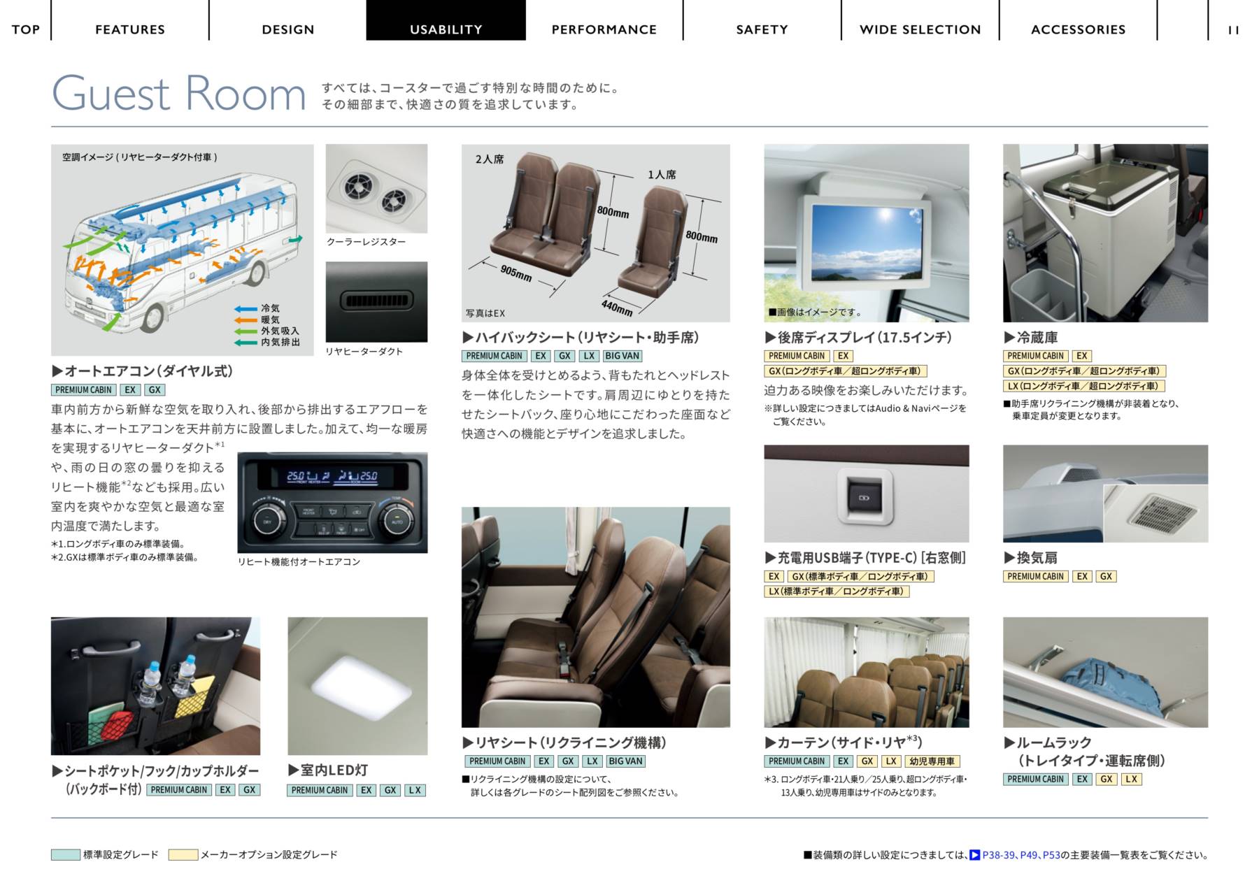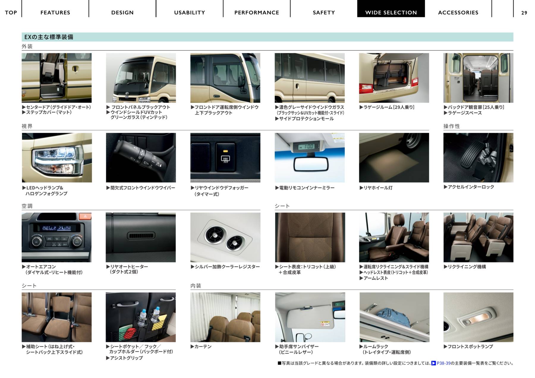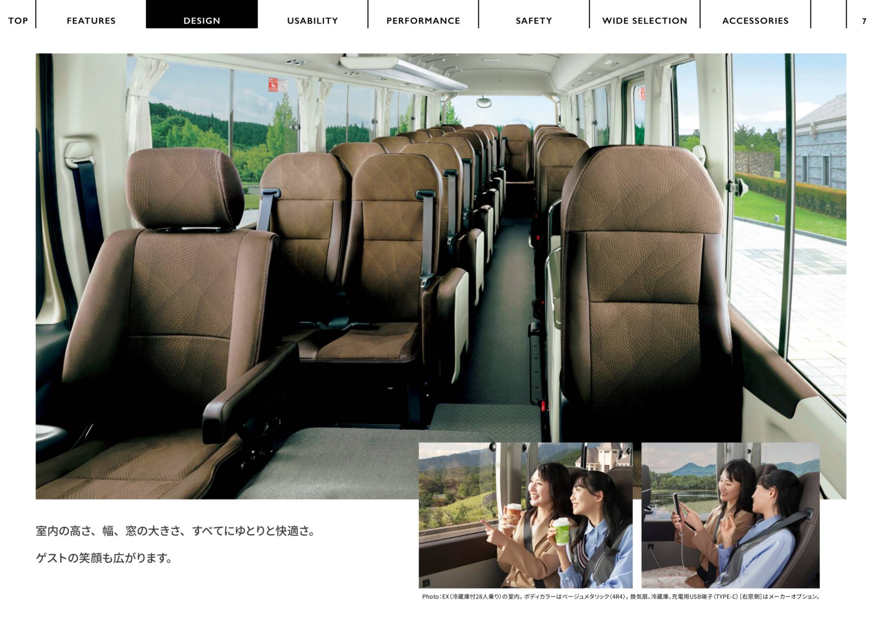 - ห้องโดยสาร: เบาะ High-back, วัสดุหุ้มเบาะตามรุ่น, Reclining, เบาะเสริมพับเก็บ, ม่าน, ชั้นวางของ, ไฟ LED, ที่วางแก้ว/ตะขอ/กระเป๋าหลังเบาะ