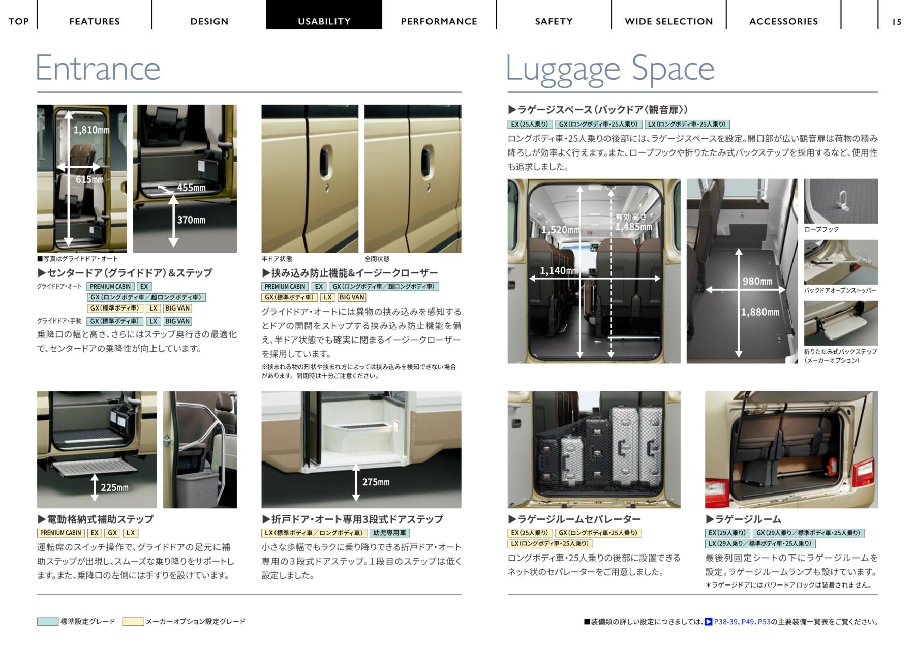 - พื้นที่สัมภาระหลัง (บางรุ่น/บางจำนวนที่นั่ง): ประตูท้ายบานคู่เปิดกว้าง มีตะขอเชือก (Rope Hook), ตัวกันเปิดสุด (Open Stopper) และสเต็ปท้ายพับได้ (บางอย่างเป็นออปชัน)